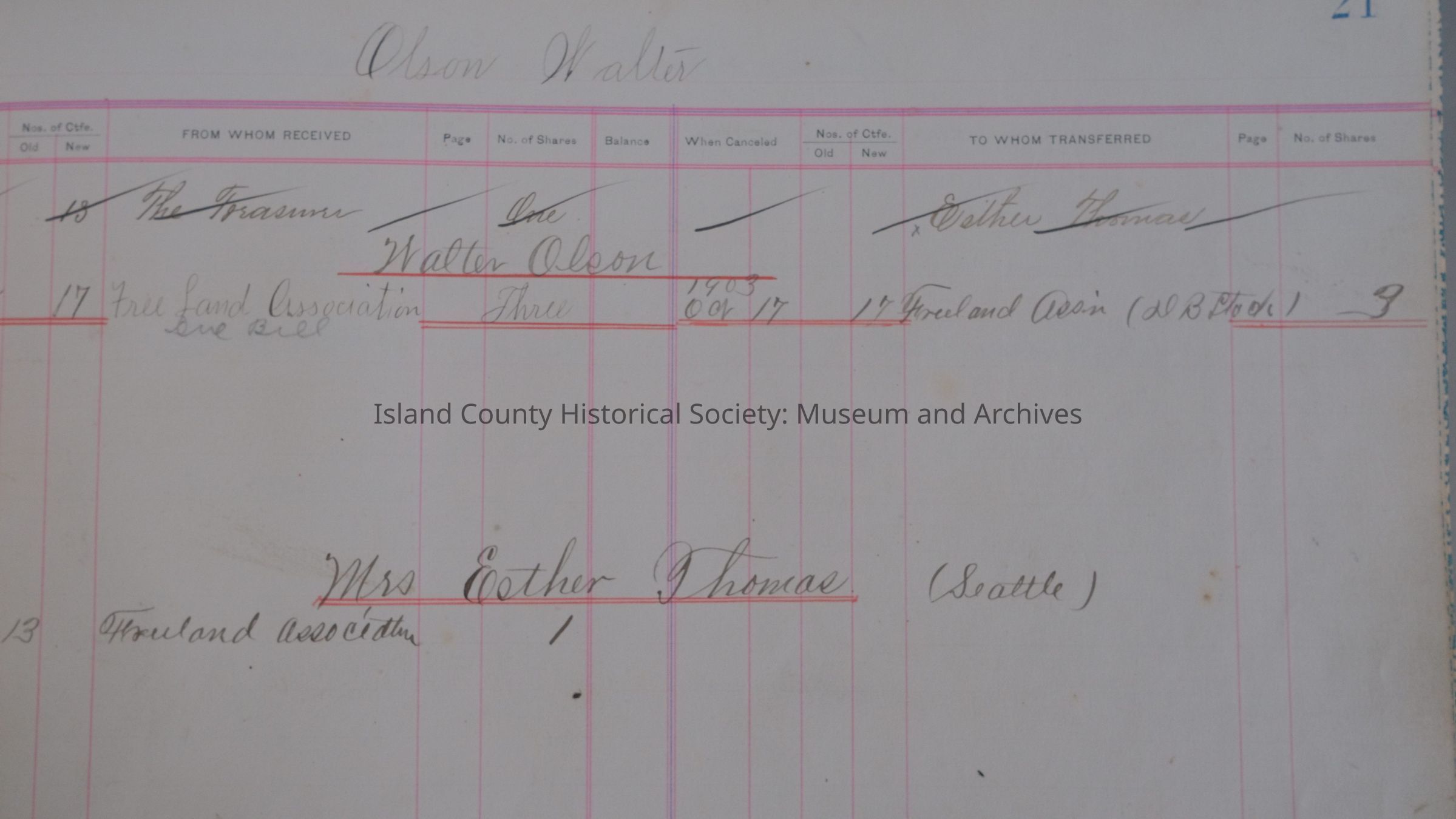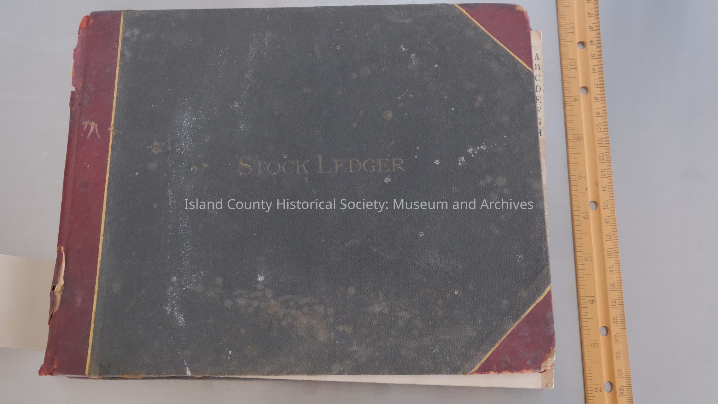 Freeland Colony Ledger, 1900-1904. Obtained from Ernest Lieseke, Freeland, WA, August 8, 1968. (Deed accession number - 2015.096) (rebind) (cover black with red corners and spine (damaged), on front: Stock Ledger, 11.5"W x 9" L x .75"H) 2015.096.001 22.1900