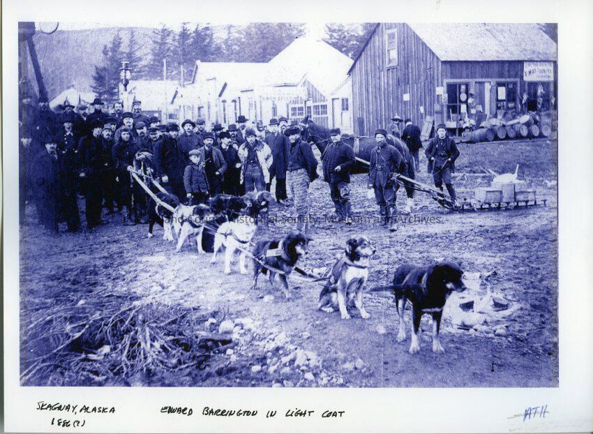 A photo of Skagway, Alaska, with a group of about 20 men and a boy watching a 6-doe dog-sled team. The boy is standing behind two other dogs. On the right is a horse pulling a sled with supplies. A store is in the back on the right with a sign "Xmas", and several kegs on the ground. Handwritten on the front: Skagway, Alaska, 1886 (?), Edward Barrington in Light Coat."