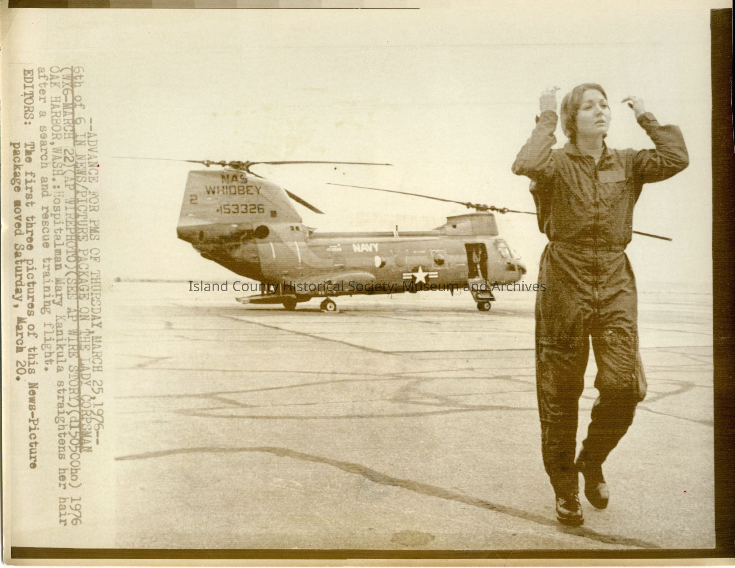 1976 - Mary Kanikula exiting helicopter after search and rescue mission