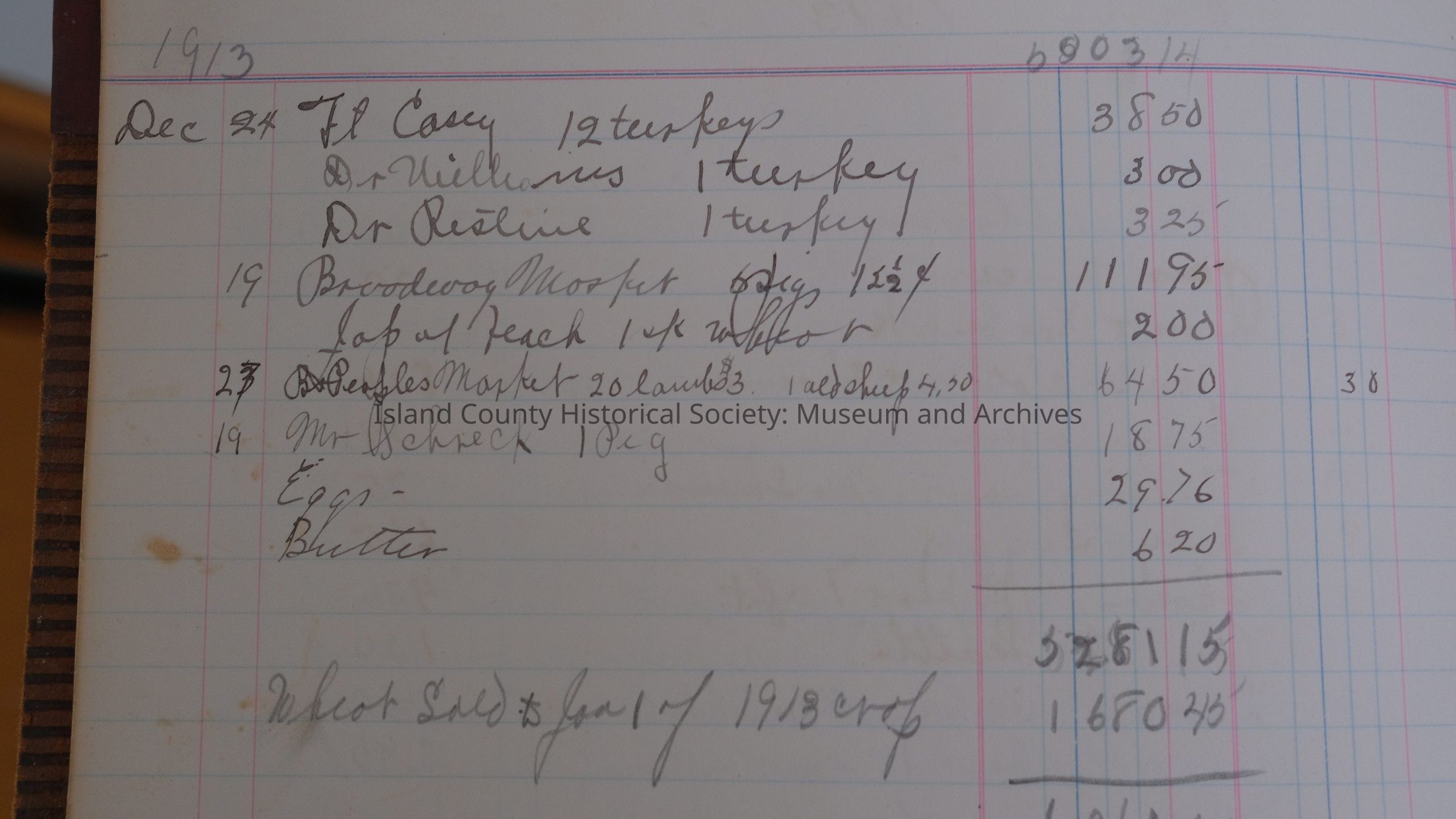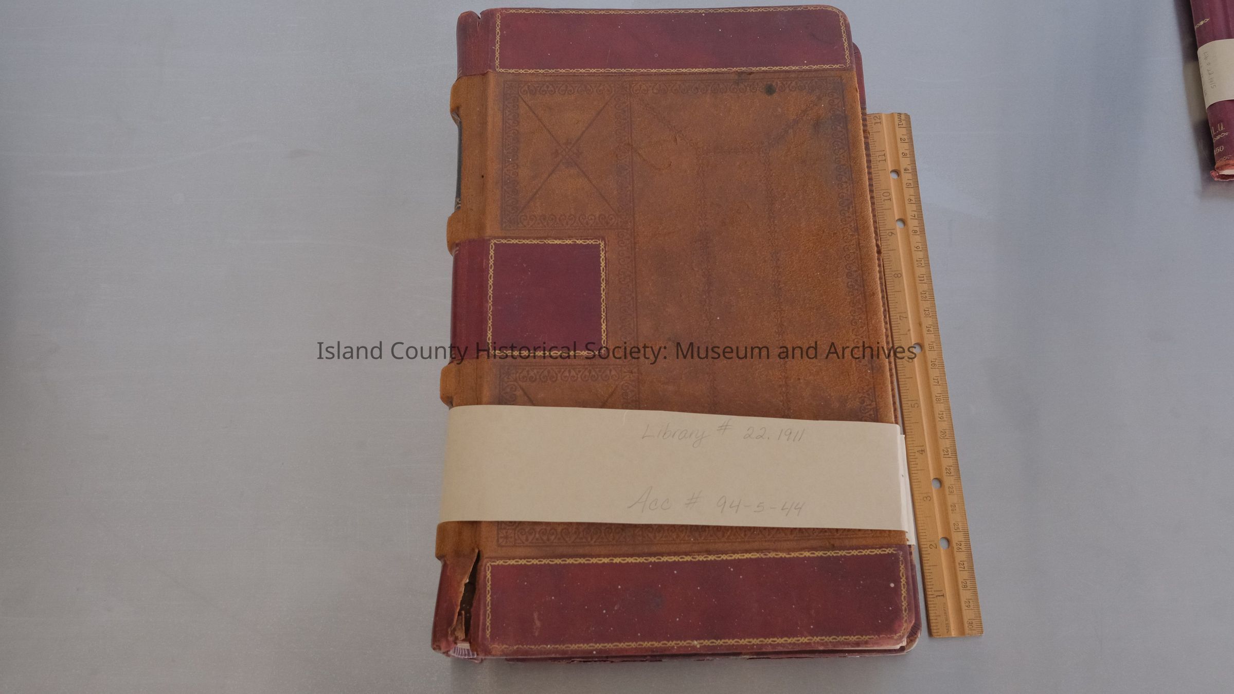 Ledger, Harry Smith Farm account book 1911-1952 (paper inserted has measurements for Ebey Landing Field), (cover brown with red on top and bottom; red and black on spine and Cash on spine; some damage to spine; 9.5"W x 14"L x 1.5"H) 94-5-44 22.1911