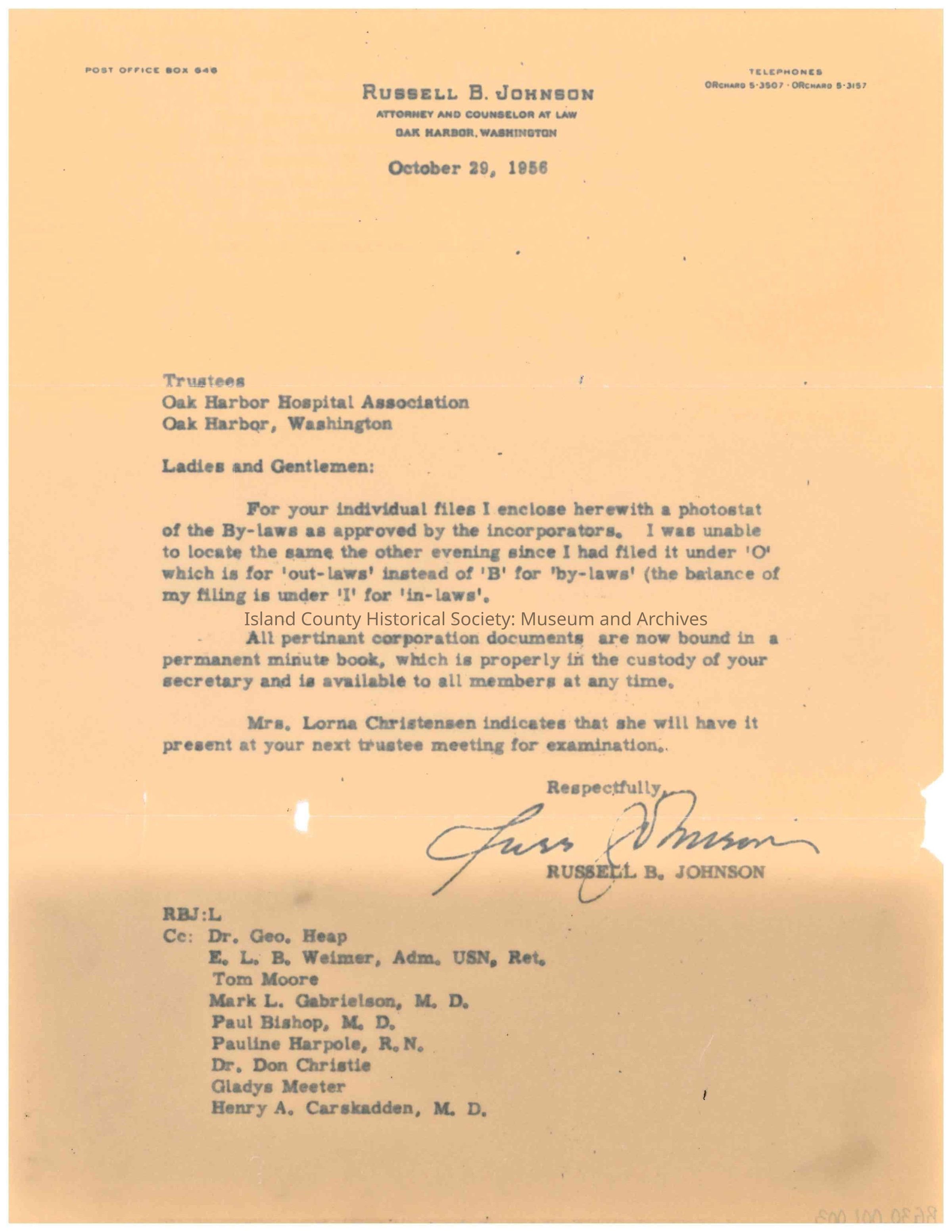 Correspondence between Russell B. Johnson, Law Office, and the Oak Harbor Hospital Association.Lexicon