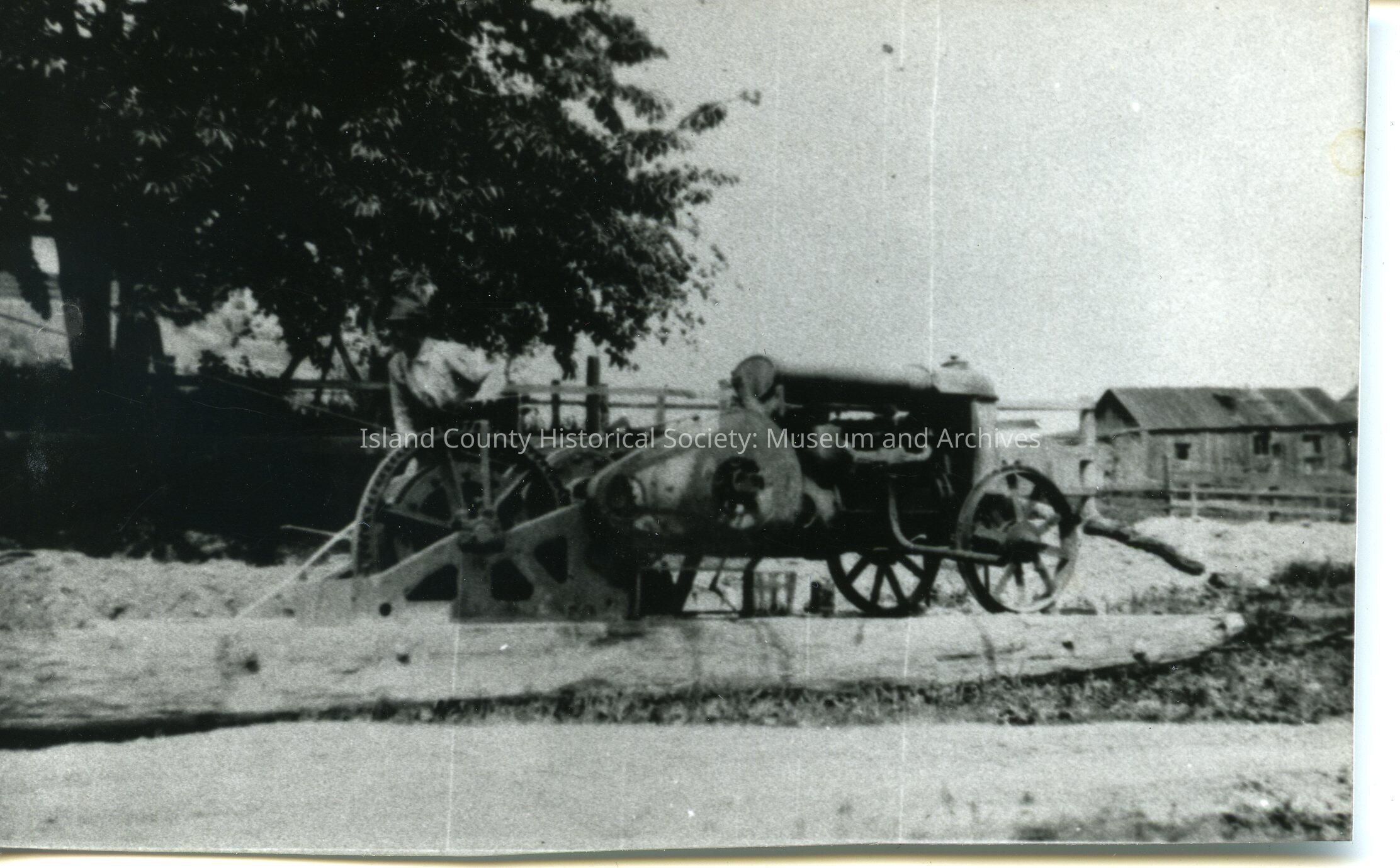 A photo of a tractor outside. There is a few large dark trees on the left. There is a barn in the background. It looks like snow on the ground. Typed on the back is "A Fordson tractor with a track on the back, hauling logs."