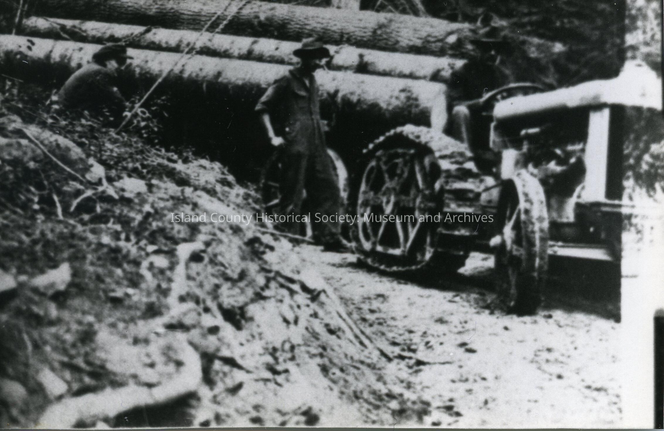 A photo of a tractor outside, with logs behind and two men. One man is sitting down, the other man is operating the tractor. Typed on the back is "A Fordson tractor on a "donkey", used near Glendale in the 1920's."