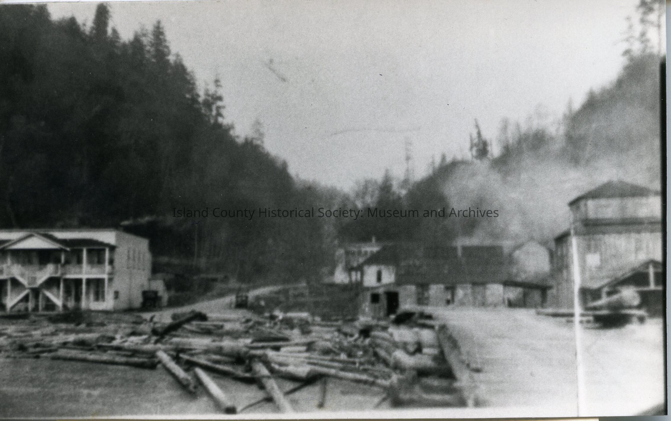 A photo of a building with logs in front. Typed on the back is "Glendale, in the 1930's. The Glendale Store, still standing, is at left - built about 1911. The Ford Garage, built about 1924-25 is seen in the middle background. On the road across the street from the store is a road grader: it was towed behind a tractor, and there were 2 on all of South Whidbey at that time. The Dance Pavillion is at the right."Lexicon