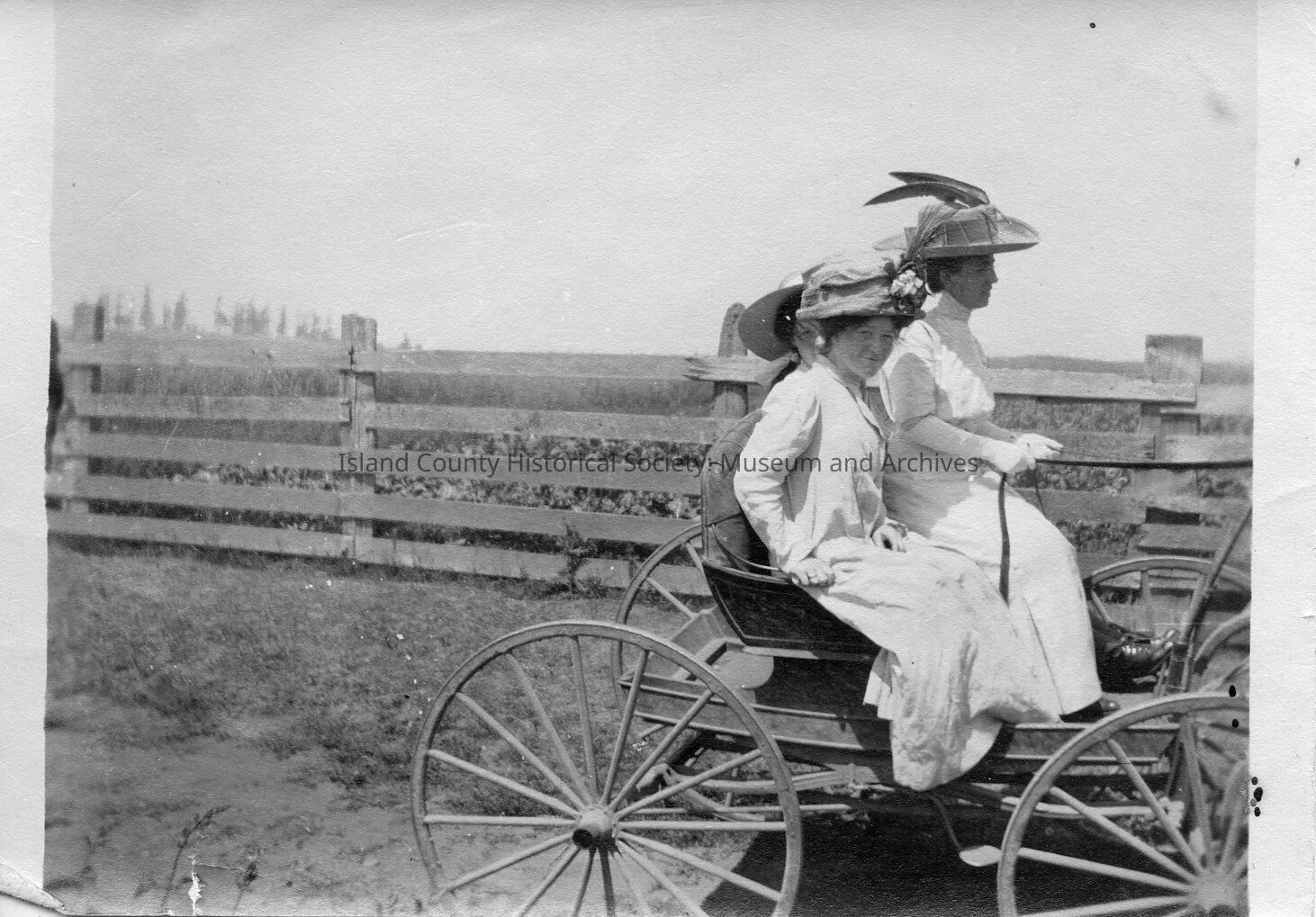 Two girls in white dresses and hats riding in a buggy. A fence and field are in the background. Taller girl holds reins. Reba Kennedy Marsh is the shorter girl in the foreground. A third girl is only partially visible. One is Alice Kellogg.