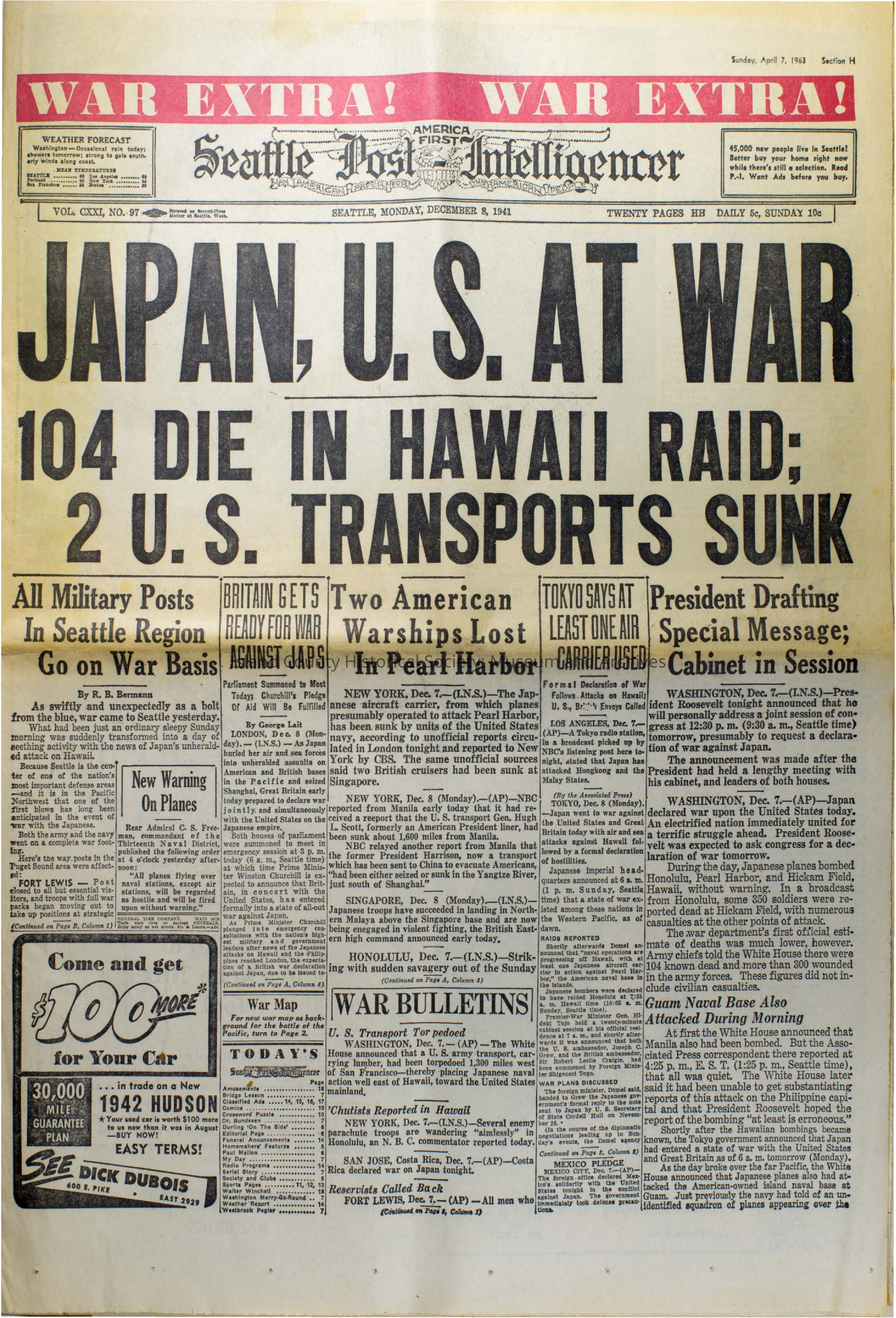 Seattle Post Intelligencer Commemorative Edition, December 8, 1941 reprinted on April 7, 1963