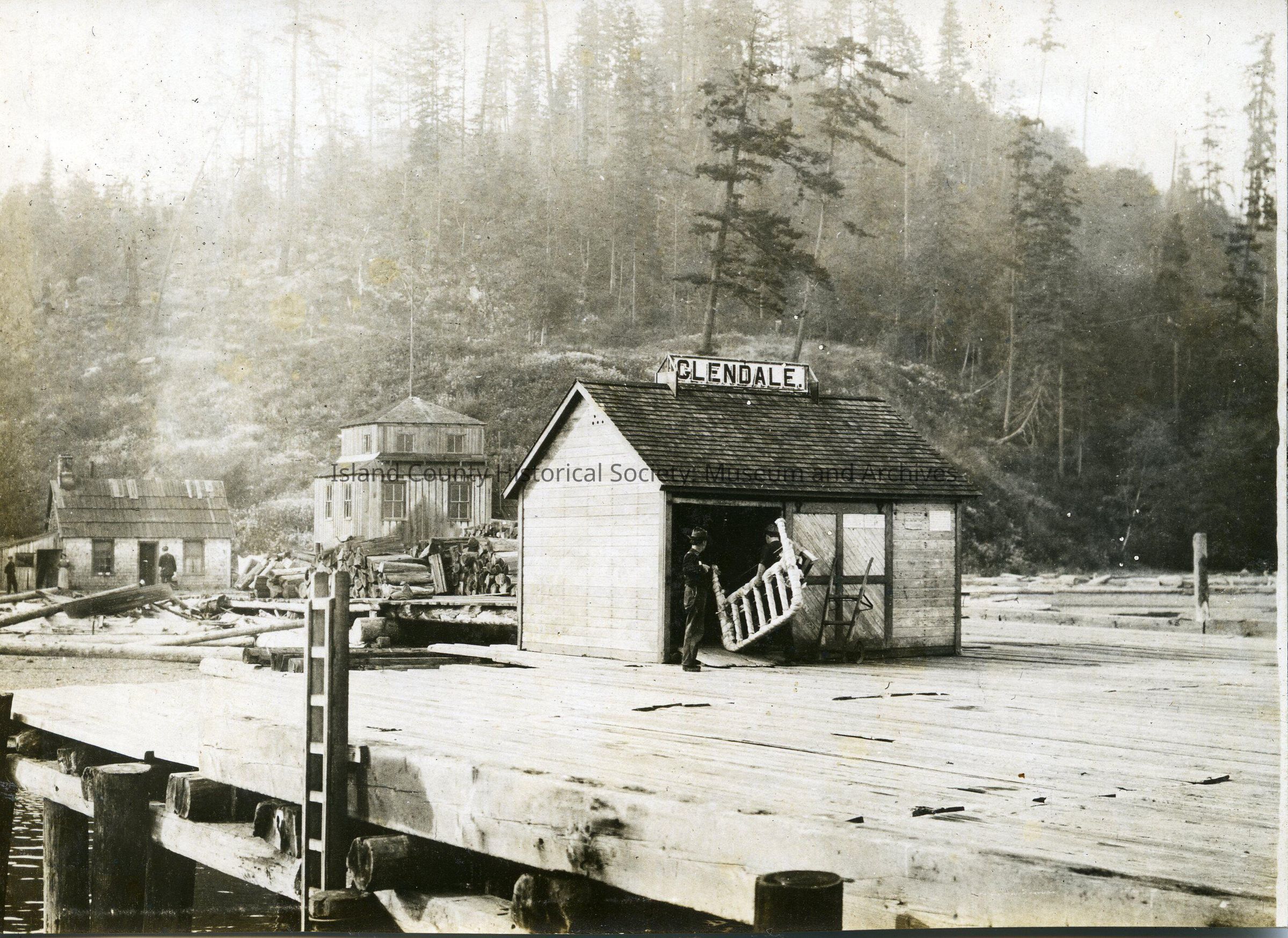A photo of a building with a sign 'Glendale' on top of the roof''. Appears to be on a wooden dock. There is a ladder hanging on the dock. There are two other buildings behind. On the back is handwritten note: "original Peck house - L. dance pavillion, wharf storage."