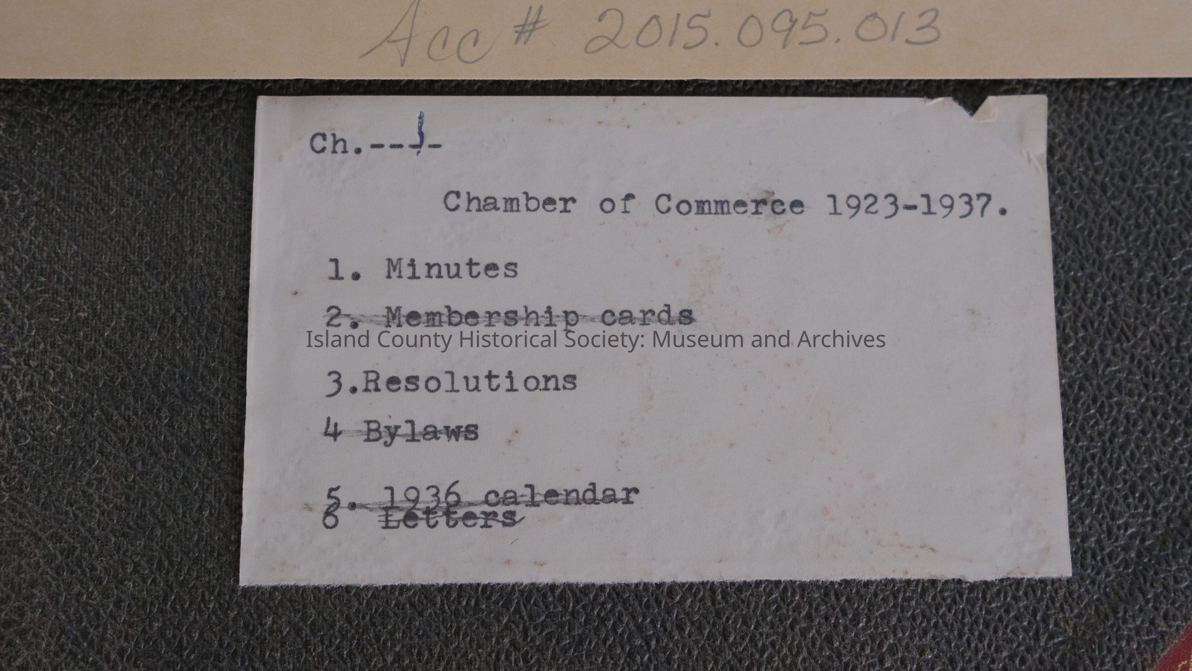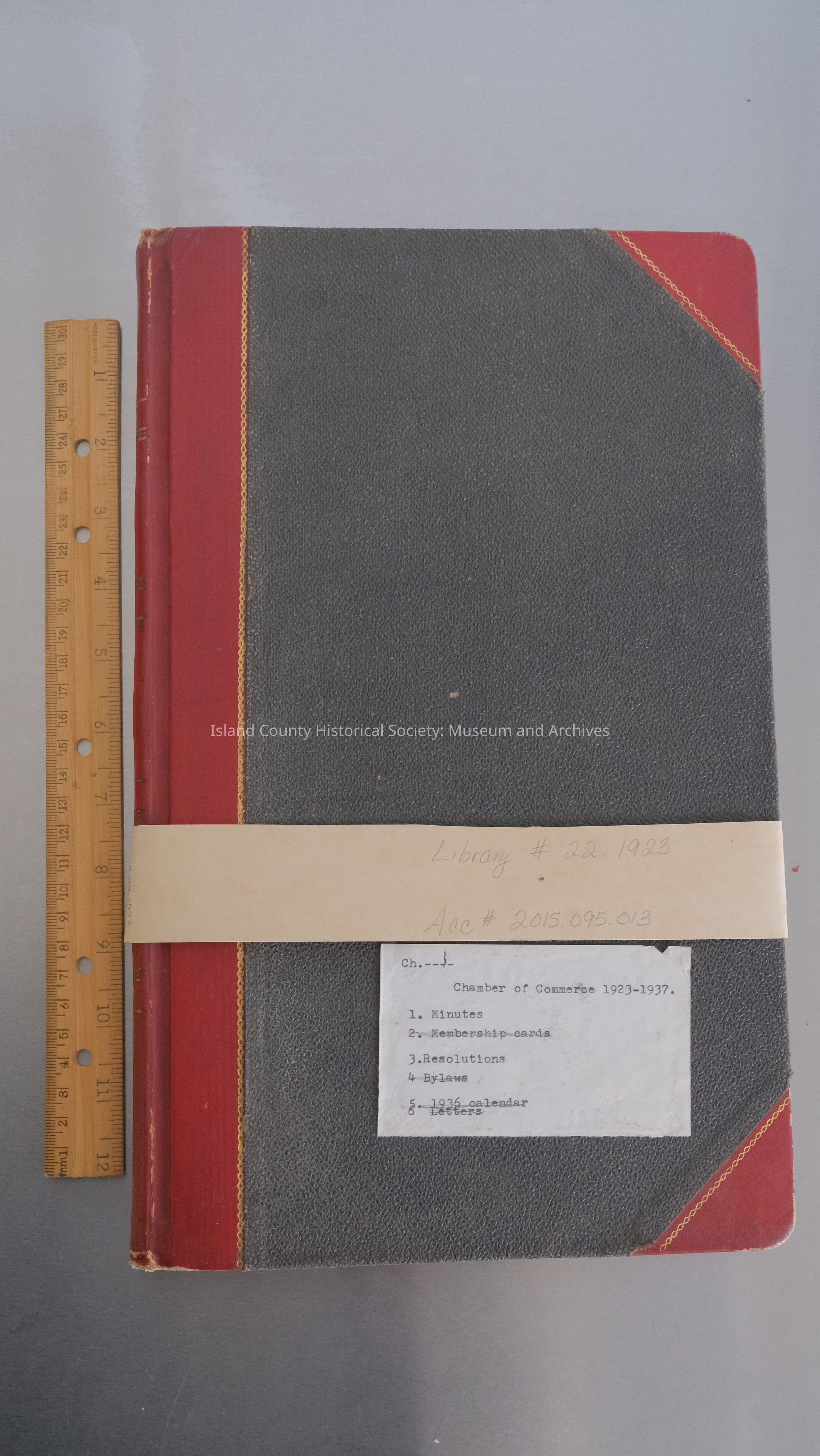 Ledger 1923-1937, Note on front: Chamber of Commerce 1923-1937, Minutes, Resolutions (cover black, red corners, red spine, rebind, 8.75" W x 14"L x .75" H) Old: #197 New: 2015.095.013, 22.1923