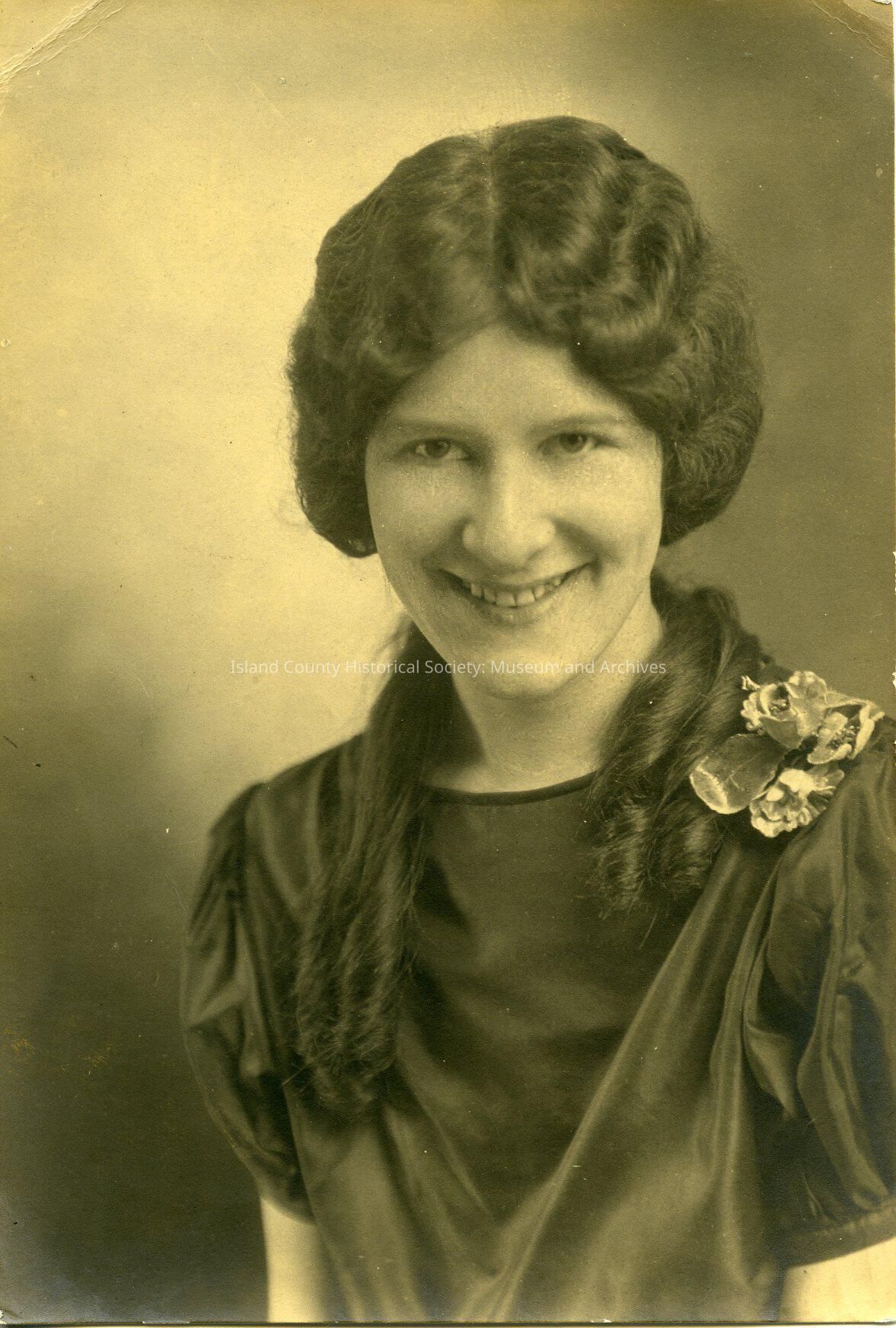 The black and white portrait is from the 1926 and 1927 Coupeville High School Graduation. The young woman pictured is Antonia Nelton, 1927.