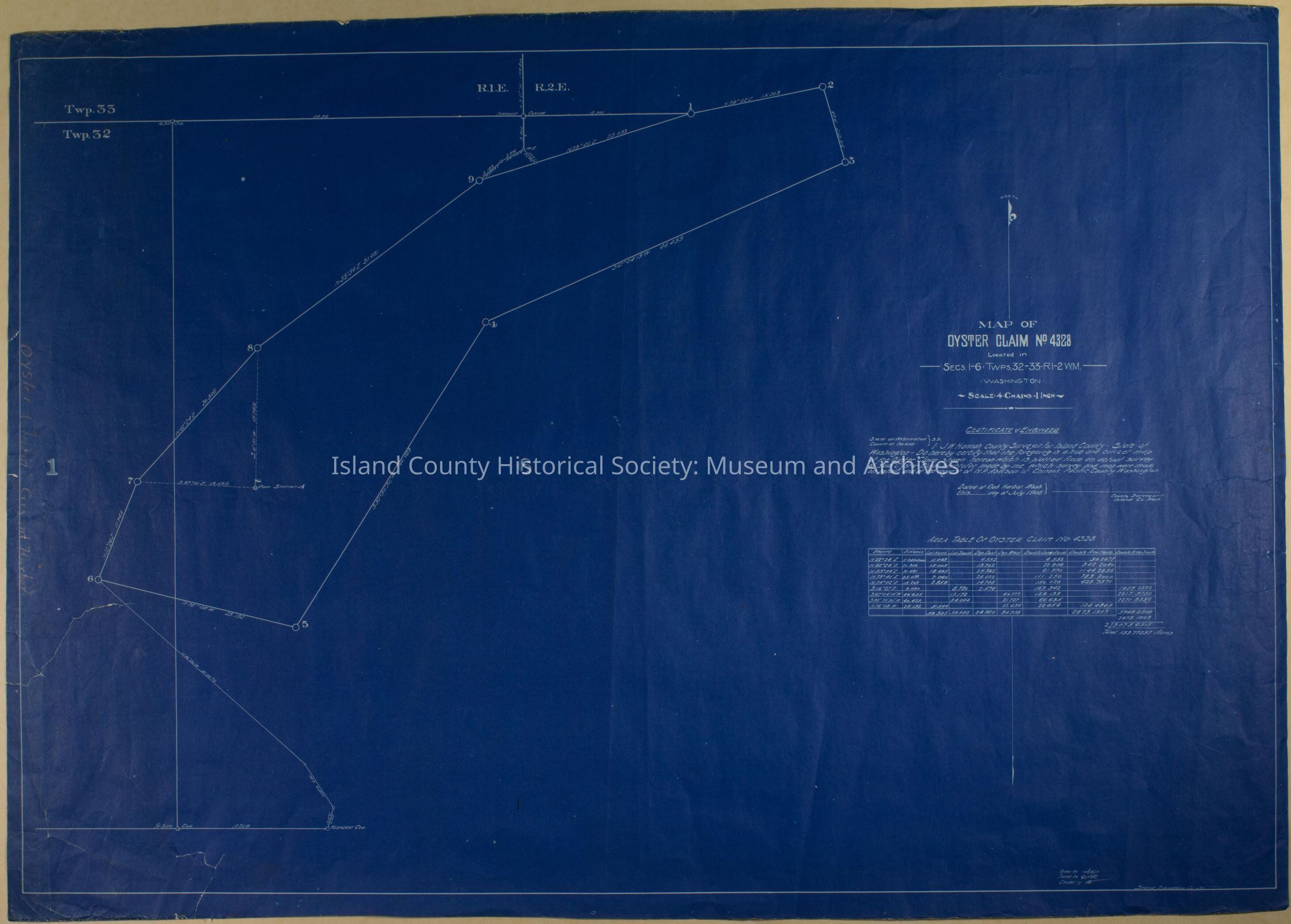 Blueprint map of oyster claim No. 4328. Sec. 1-6, Townships 32-33,R1-2 W.M. July, 1906