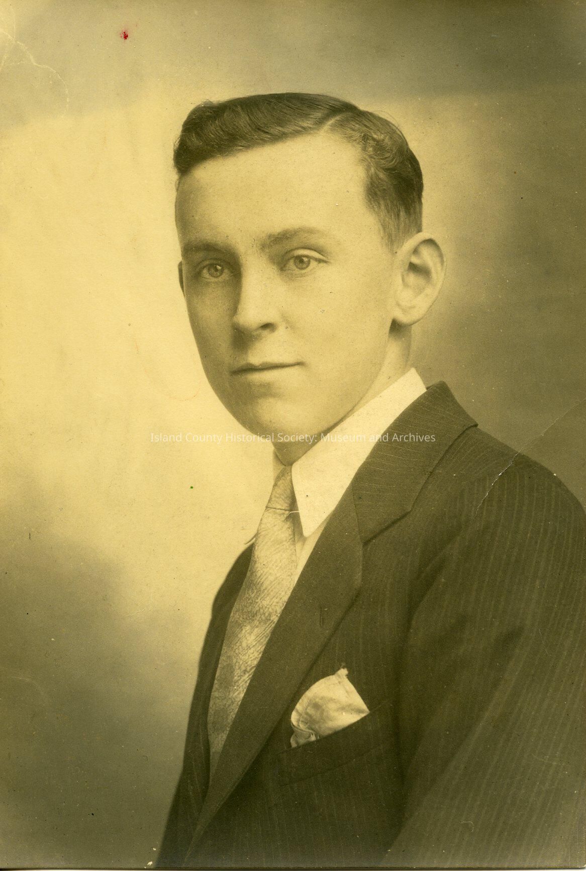 The black and white portrait is from the 1926 and 1927 Coupeville High School Graduation. The young man pictured is Max Newberry, 1927.