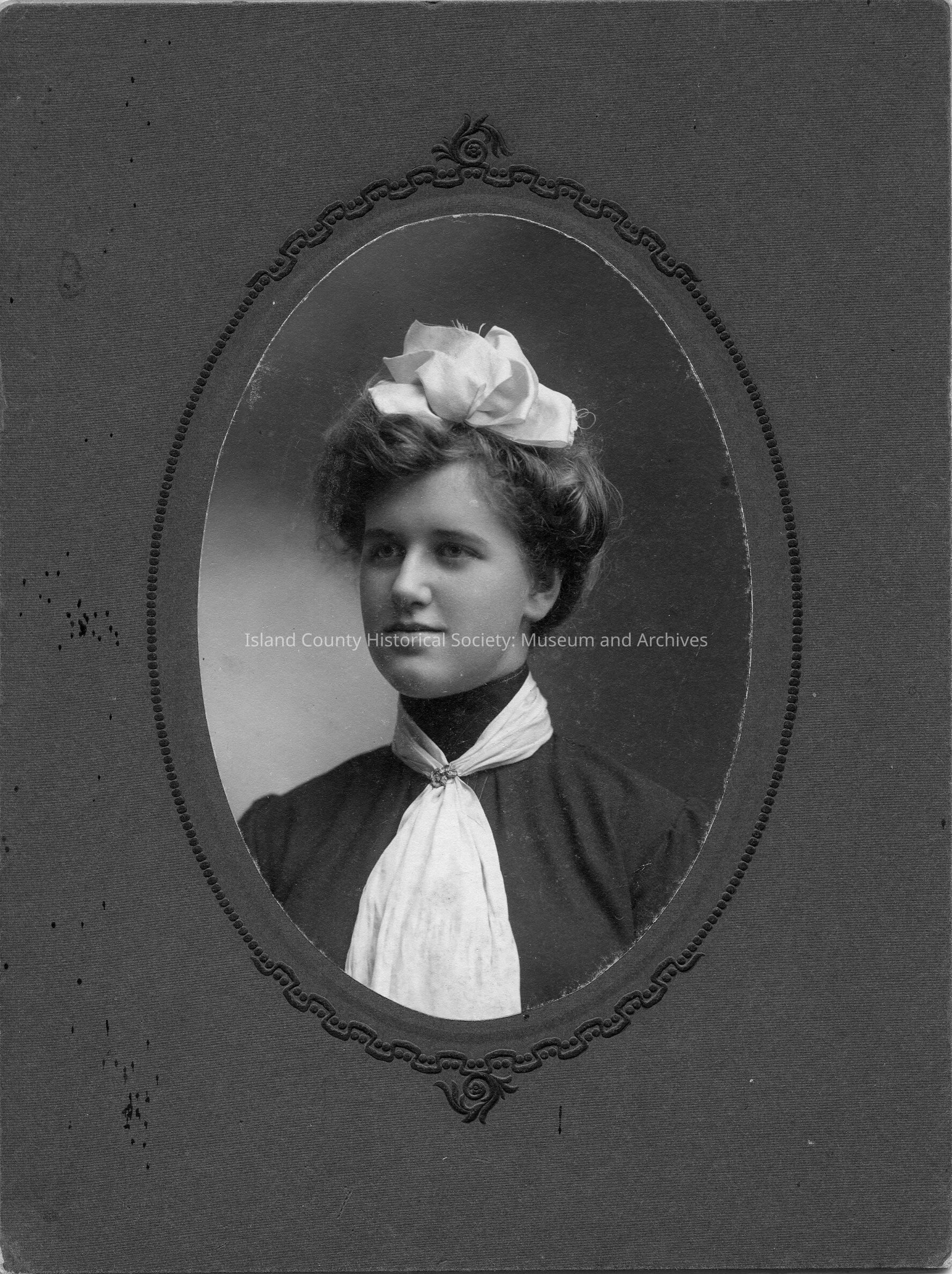 Maud Ethel Kineth, daughter of Albert Kineth. Oval portrait. She wears bow on hair and scarf.
