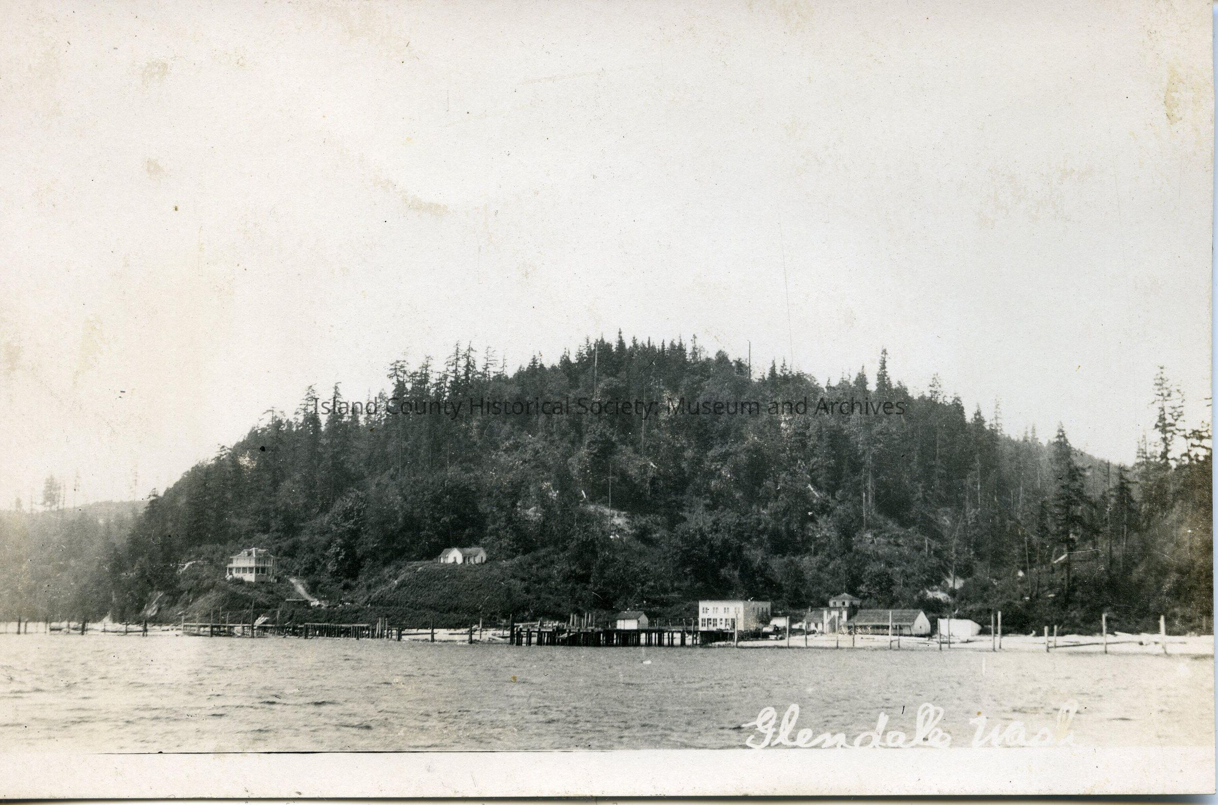 A photo on a postcard of a small town on a beach with a wooded hill behind. There are a few houses on the hill and two or three wharves or piers. Handwritten on the back is from "Miss Nora Hun,,(?)...Langley. (date is) 12/14/12." Almost illegible on the back: "Compliments Glendale ... " Handwritten on the front is "Glendale Wash..." Postmarked Dec 14, 1912 from Glendale.