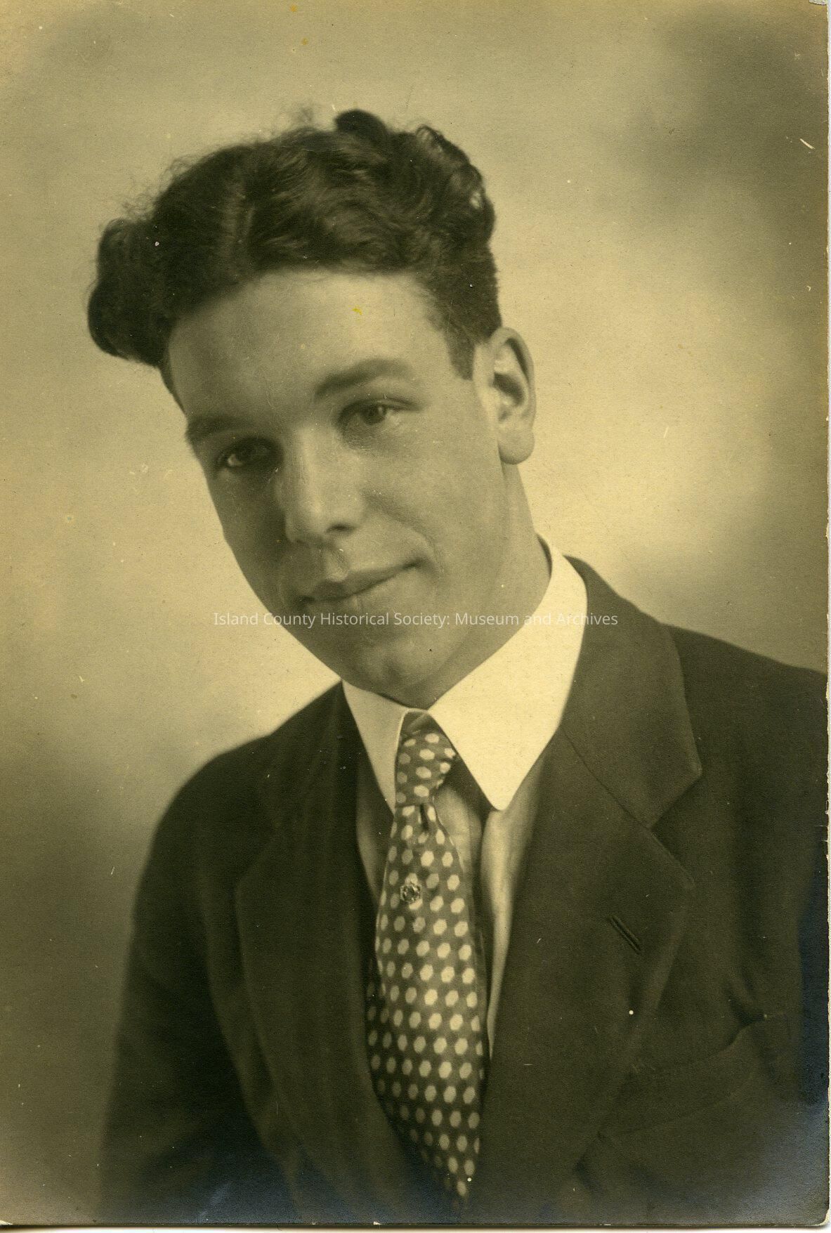 The black and white portrait is from the 1926 and 1927 Coupeville High School Graduation. The young man pictured is Howard Jenne, 1927.