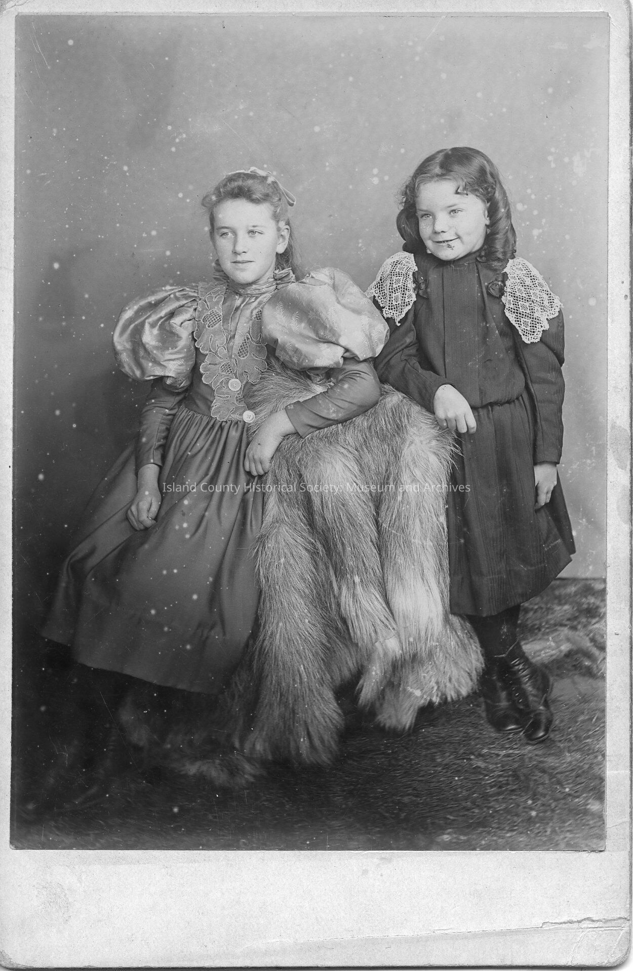 Maud Ethel Kineth (on left) and Emma Laretta Kineth (on right). Albert Kineth's daughters. Maud sits on fur and Emma stands.