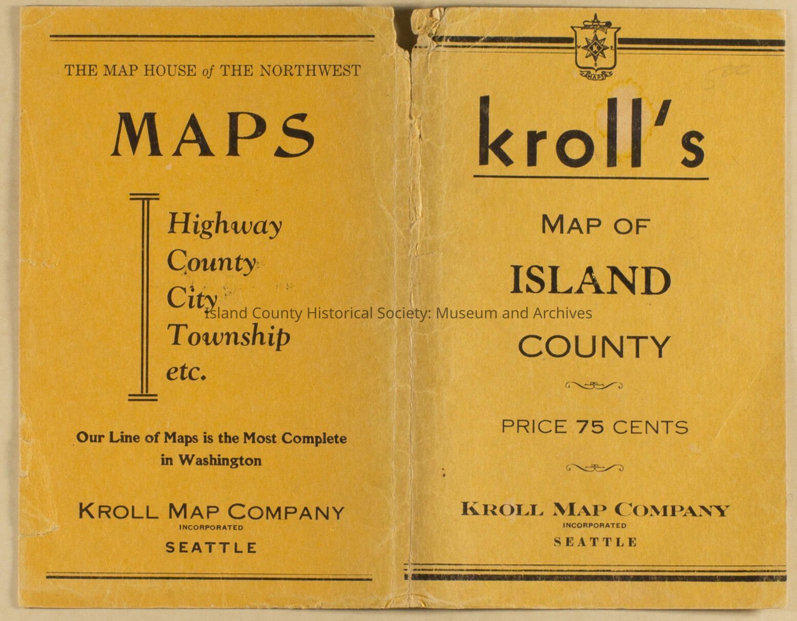 Kroll Map Company Seattle - Map of Island County. Front & back map pocket covers. Price 75 cents.