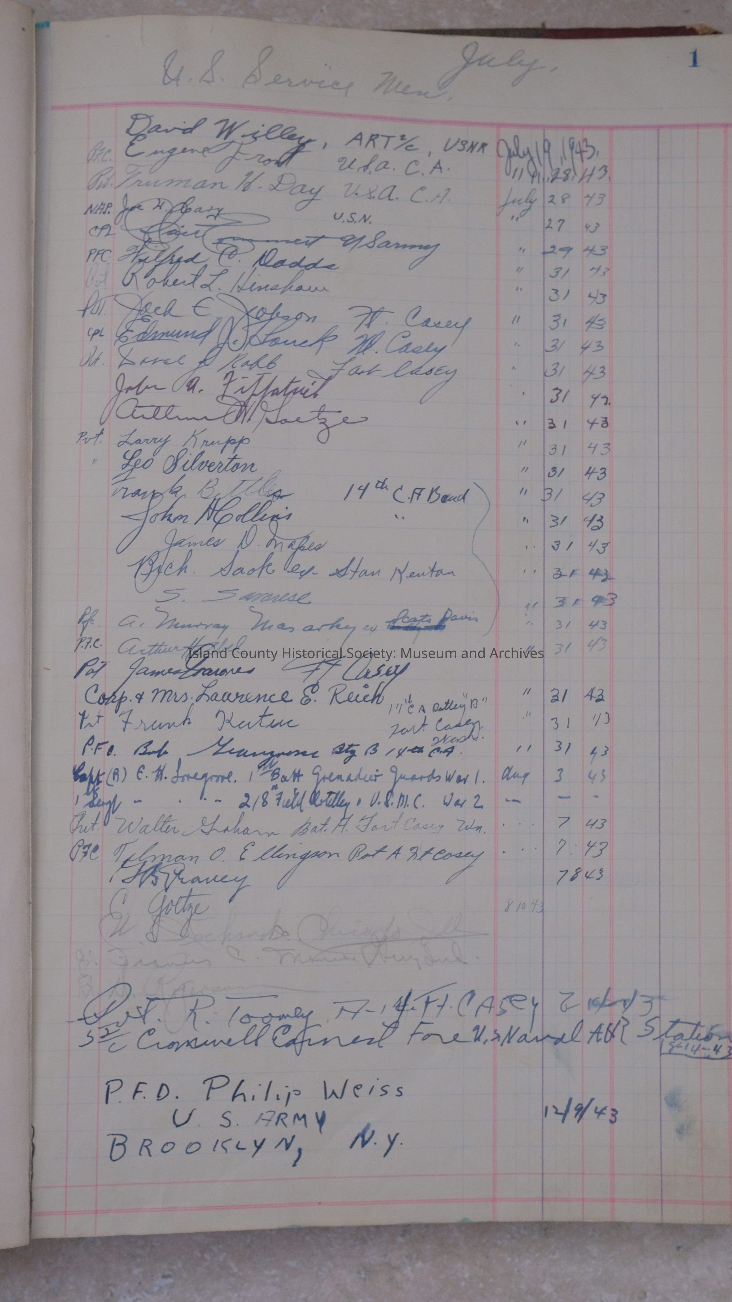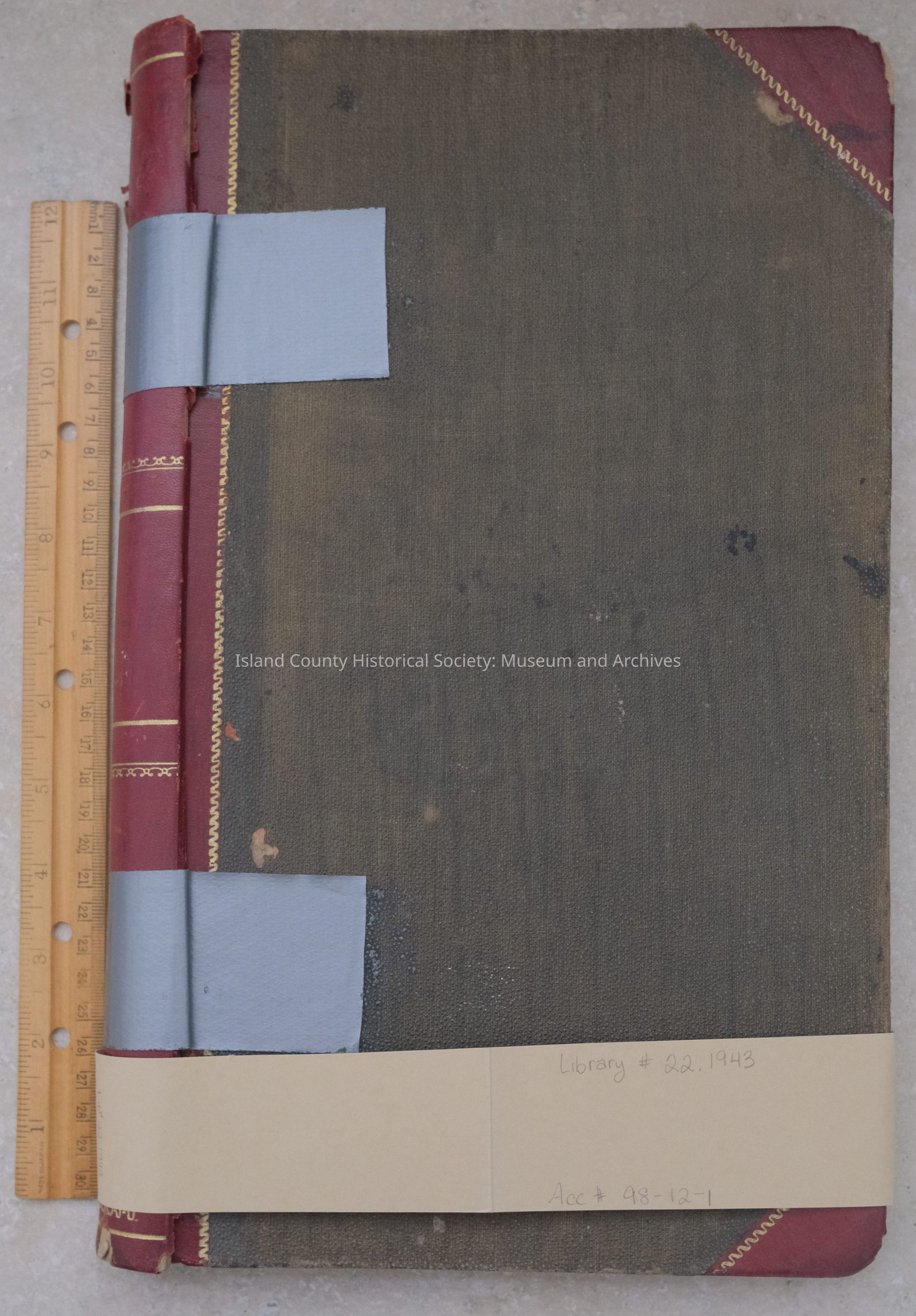 Ledger, Coupeville Recreation and Service Club Guest Book, 1943-1946, cover held by two pieces of duct tape, (9"W x 14.25"L x 1.25"H) 98-12-1 22.1943