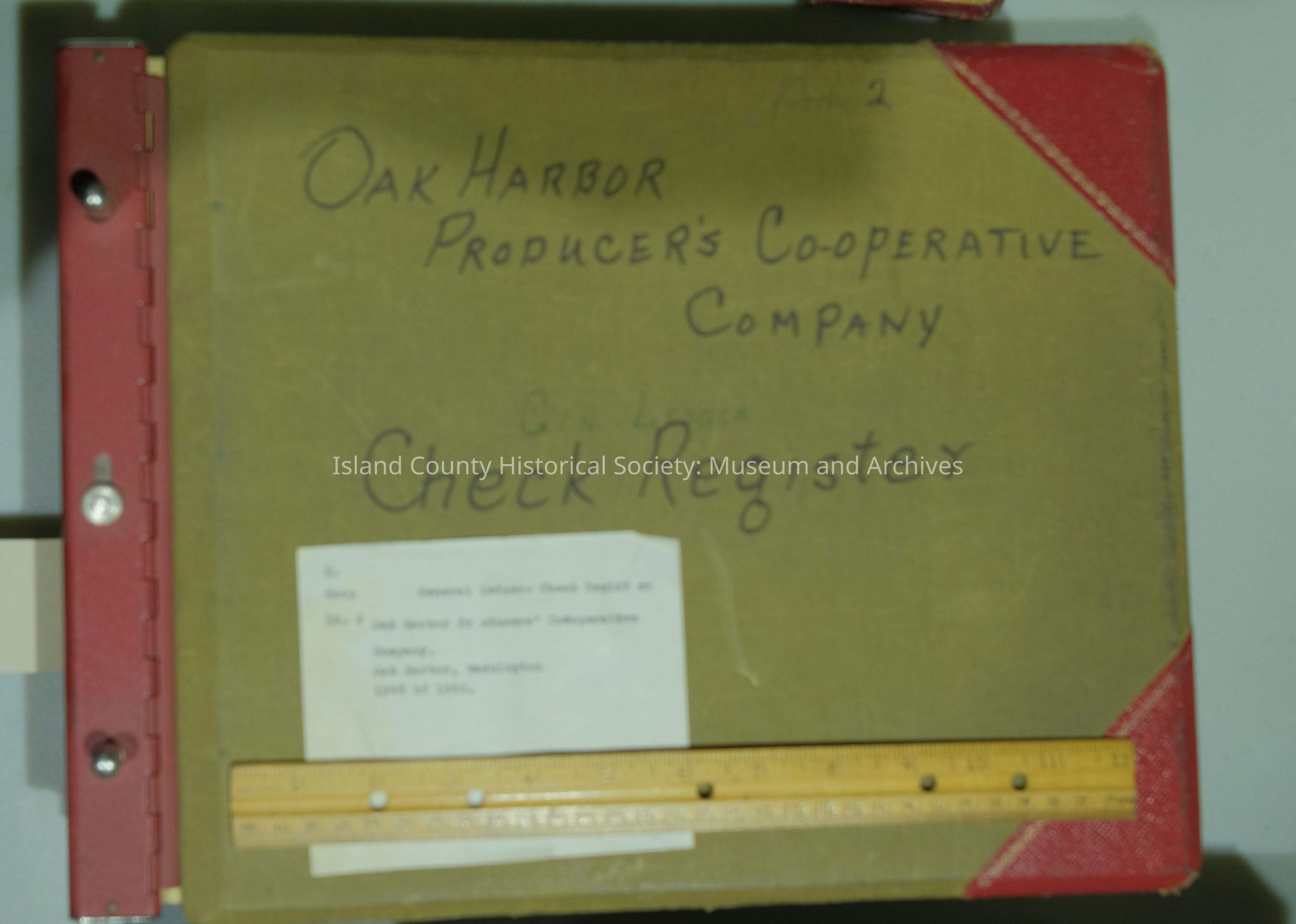 Ledger Oak Harbor Producers' Coop Co., 1912-1960, Book Two, 1948-1960. (Cover: General Records, Oak Harbor Producers' Cooperative Company Check Register; taped on cover: C. Coop General Ledger - Check Register Bk. 2 Oak Harbor Producers' Cooperative Company Oak Harbor, Washington 1948 to 1960.; green, dark red corners, red knobs on binder rods; 14.75"W x 12"L x 3.25" H) 2015.095.021 22.1948