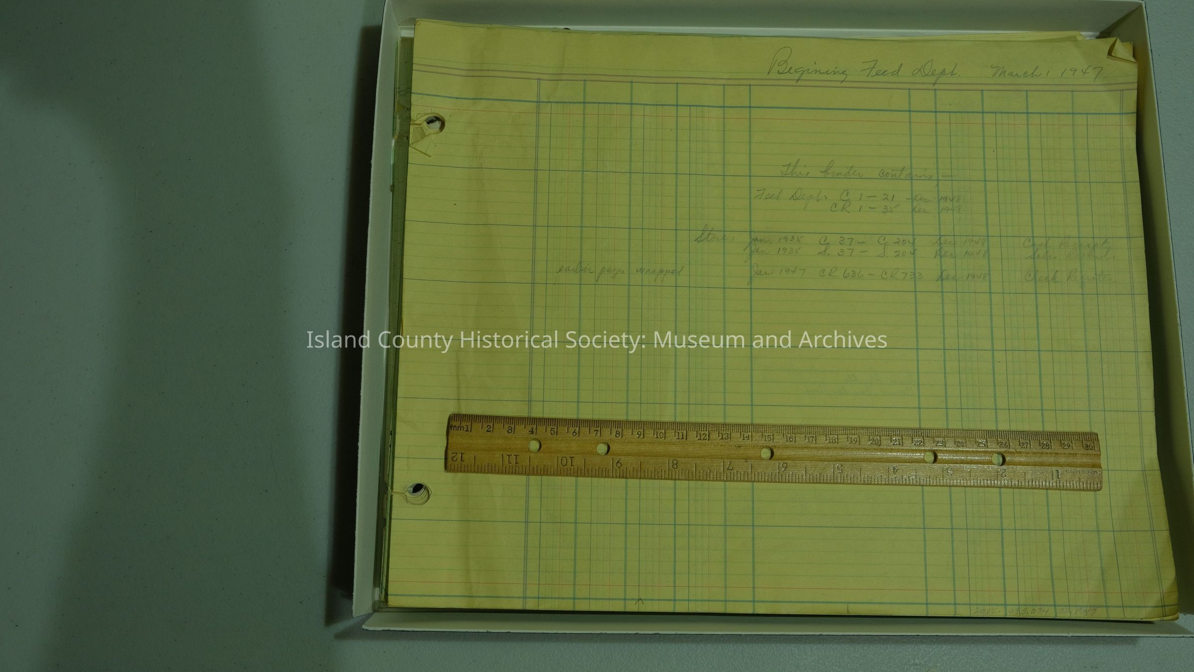 Ledger, Beginning Feed Department Oak Harbor Producers' Coop Co. 1947-1952. Head Office Control Account. (Separate accounting) (wide yellow loose pages) 2015.095.074 22.1947