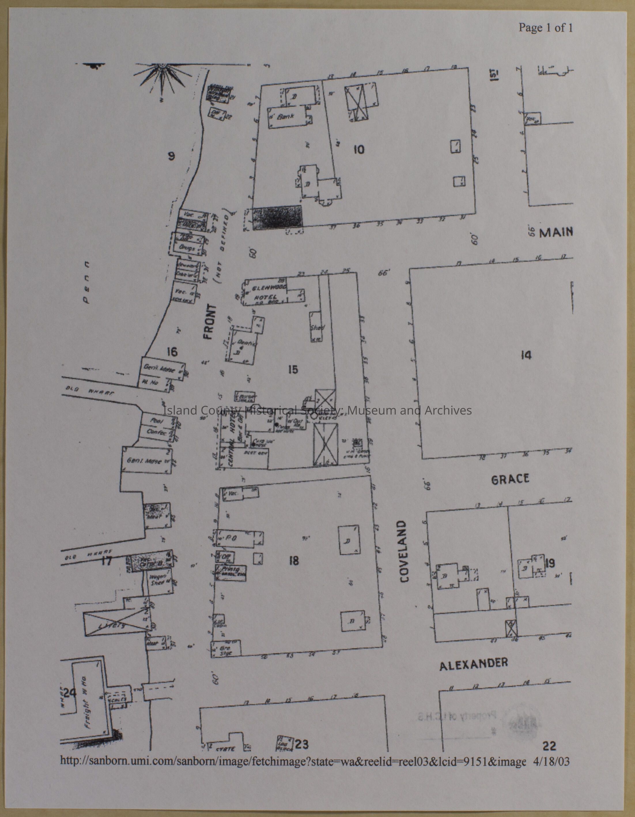 Sanborn City of Coupeville maps. Certified Sanborn Map Copyright 1909. Shows buildings on Alexander, Grace, Main and Coveland streets.