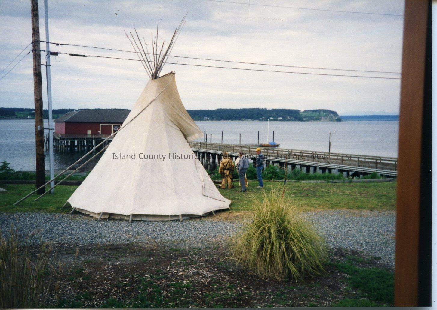 A color photo of a white teepee near the Coupeville dock. There are three people standing beyond it. Handwritten on the back is "May 5, 1995."