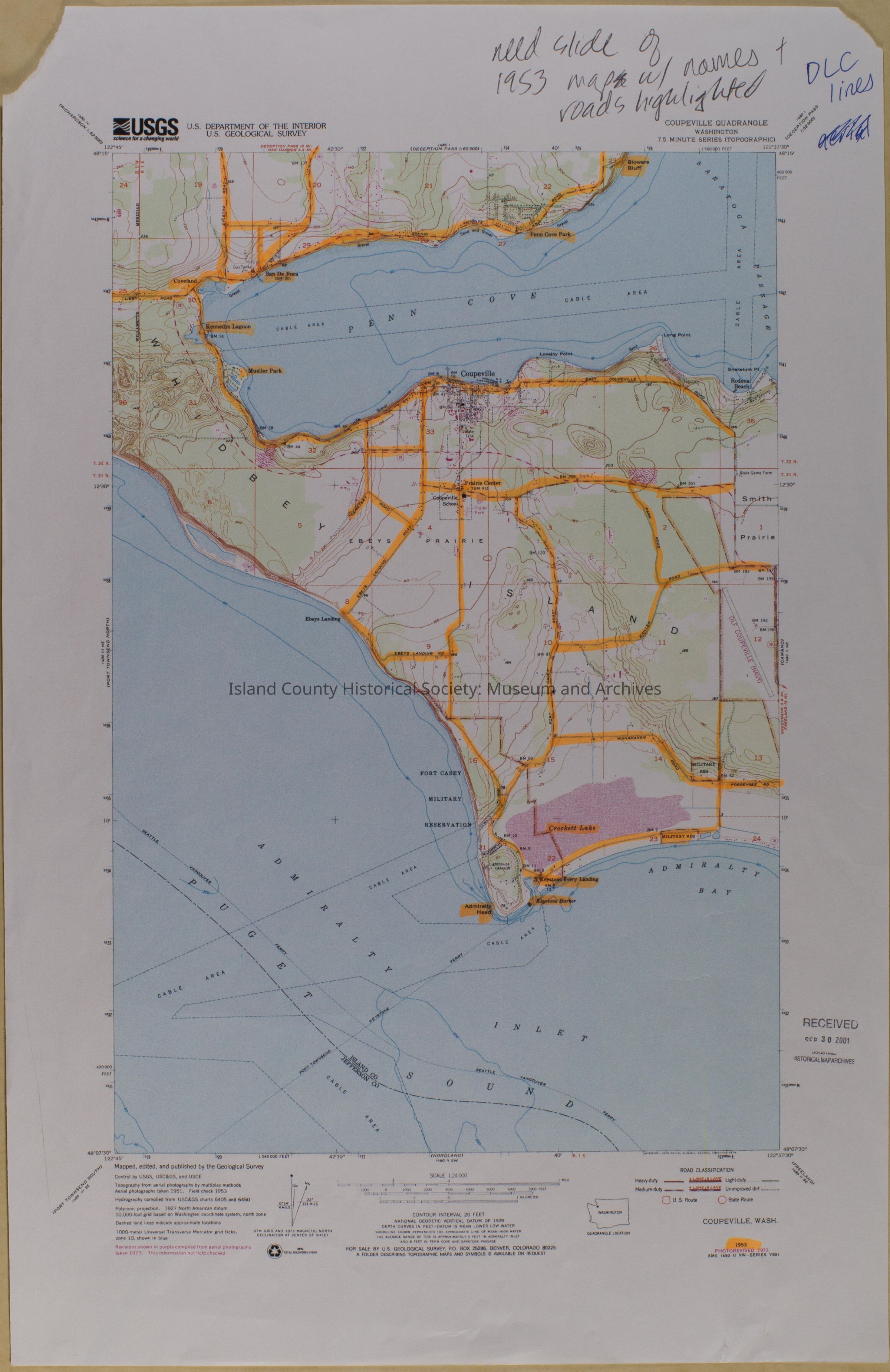 USGS map of Crockett Lake area; roads highlighted. Original map was made 1953 and was photorevised in 1973.