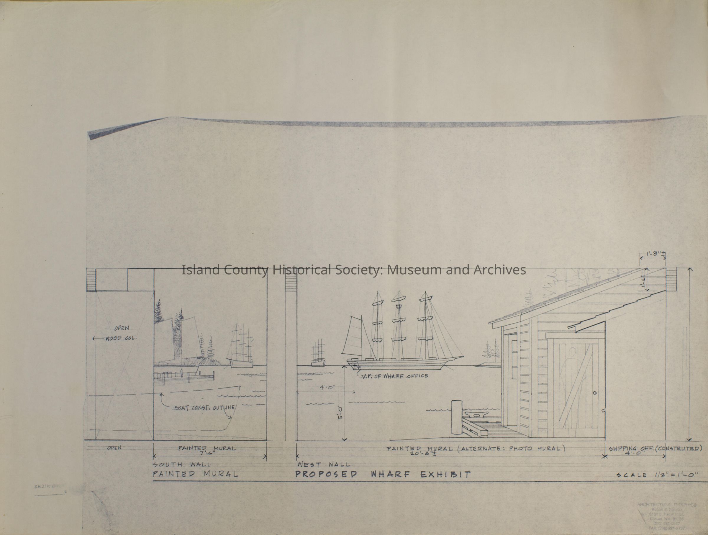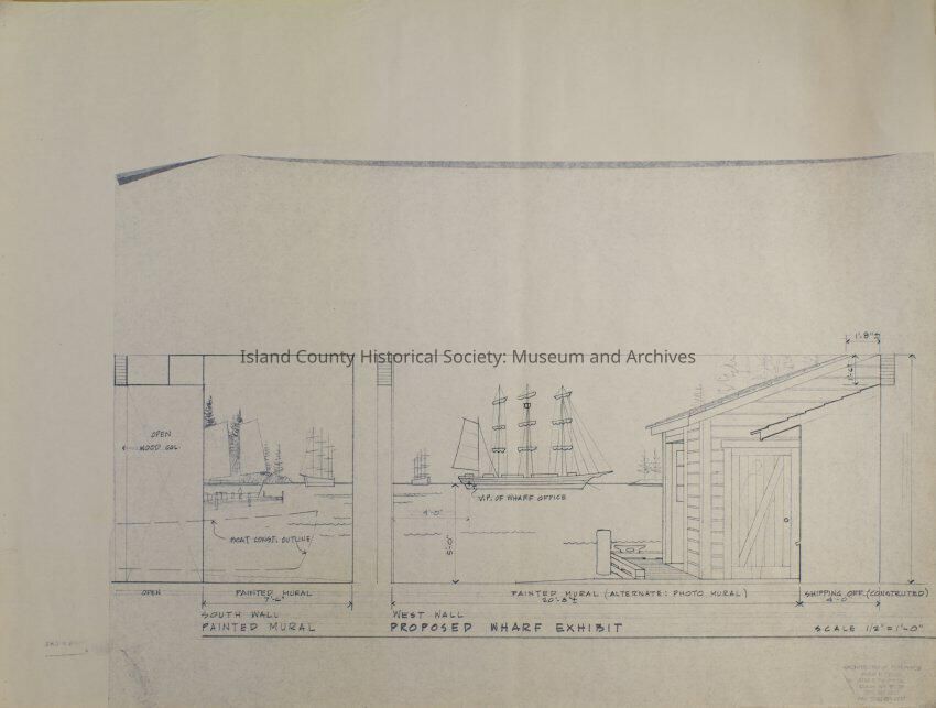 Architect Drawings of Proposed Wharf Exhibit. Drawings of painted murals of sailing ships and the wharf office. Duplicate of 2008.017.003a.