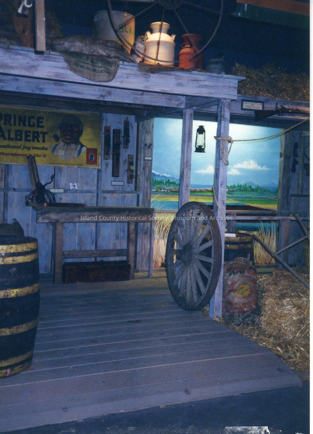 A color photo of a Musem exhibt. Showing an old wheel and a barrel and a sign that says Prince Albert. There is hay stacks on the right. Handwritten on the back is "Apr 20, 1995."
