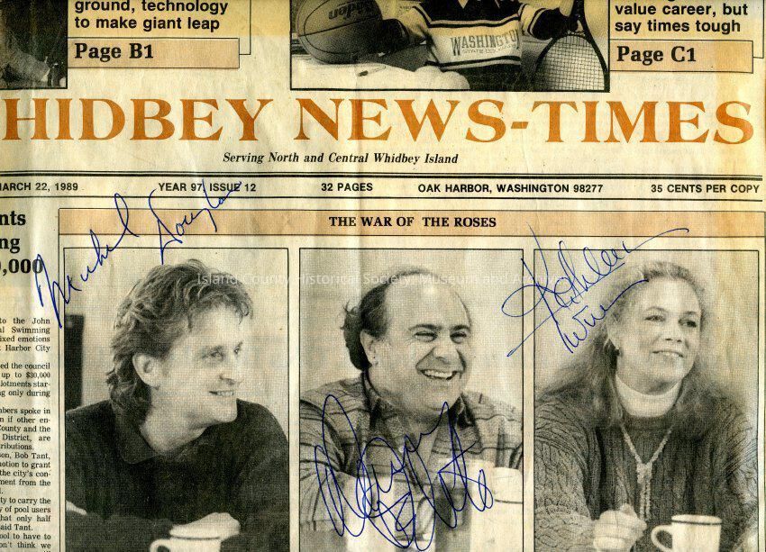 Whidbey News Times newspaper dated Wednesday, March 22, 1989, Year 97, Issue 12. The front cover of this newspaper is autographed by Michael Douglas, Danny Devito, and Kathleen Turner the main characters from the major motion picture the War of the Roses.Lexicon