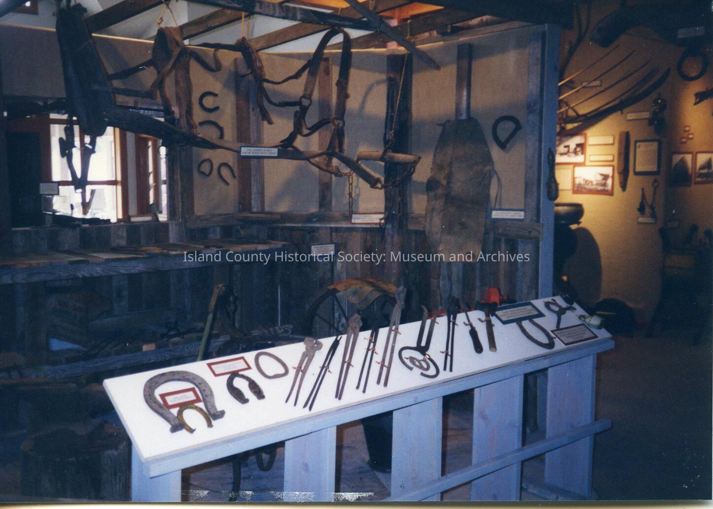 A color photo of a Blacksmith Shop exhibit. Tools are on a white wooden shelf and hanging from the ceiling. Handwritten on the back is "Apr 20, 1995."