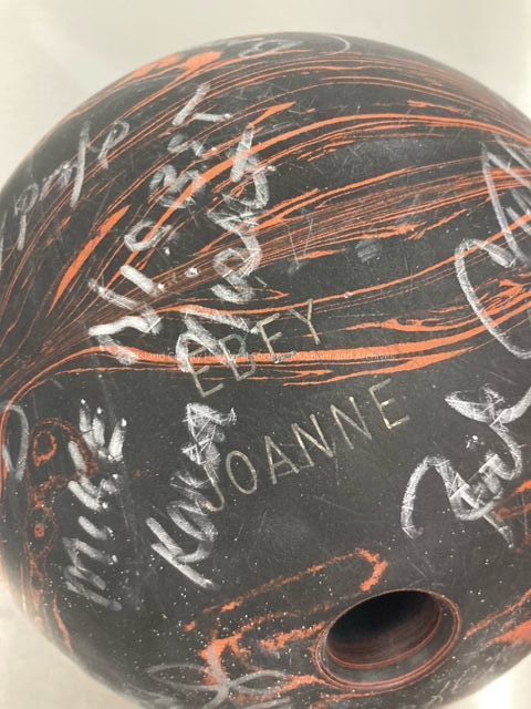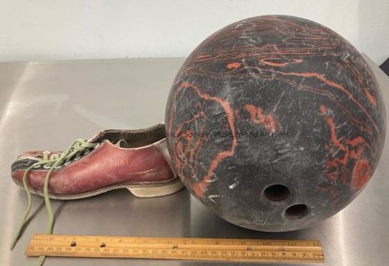 bowling ball (engraved "Ebey Joanne") maroon bowling shoe ("4" on heel) from Ebey BowlCollection
