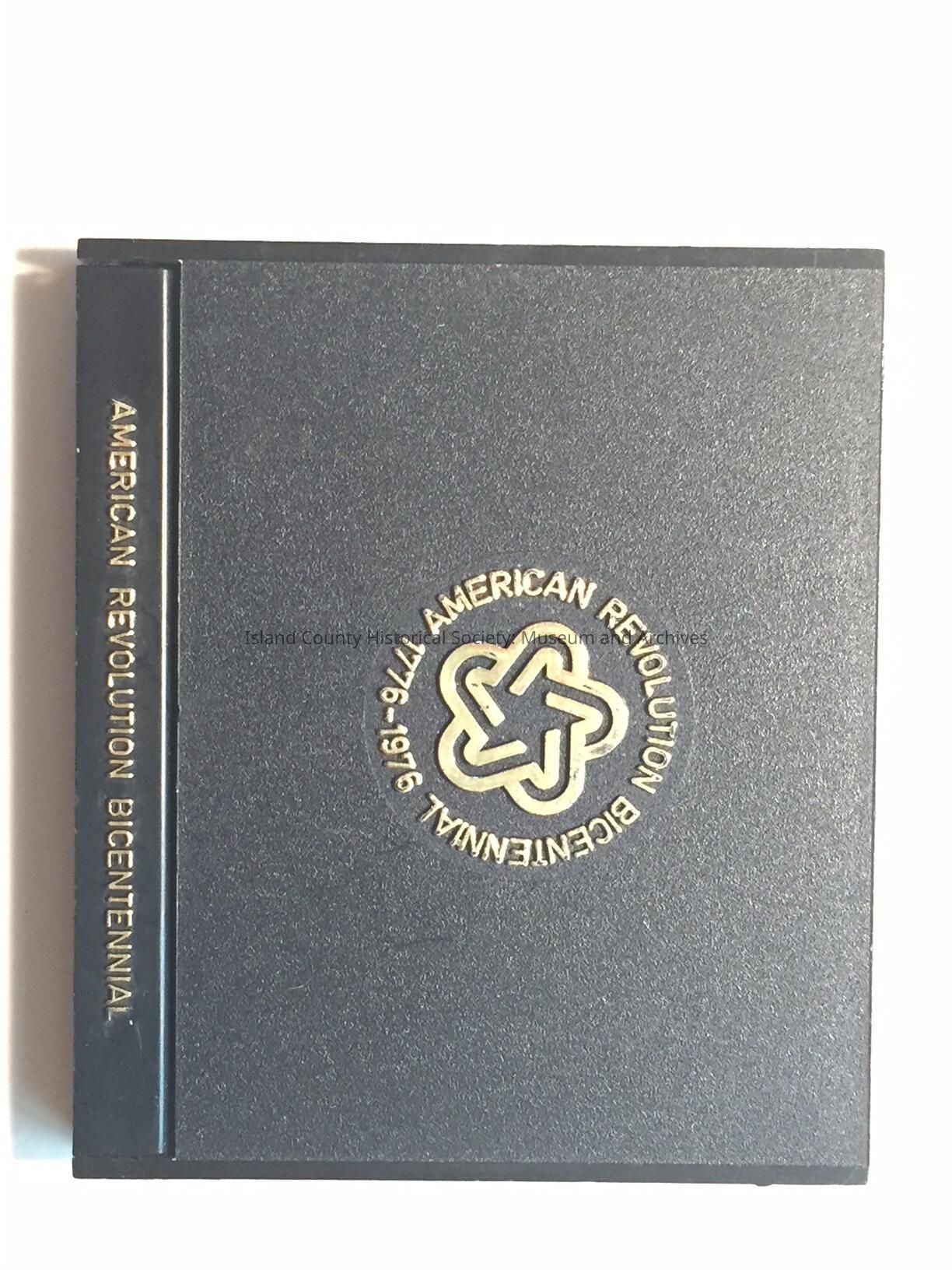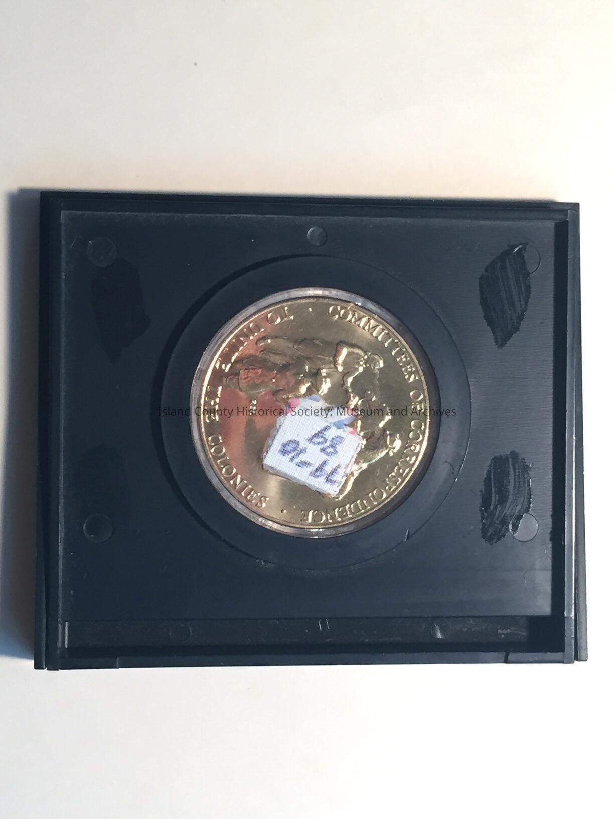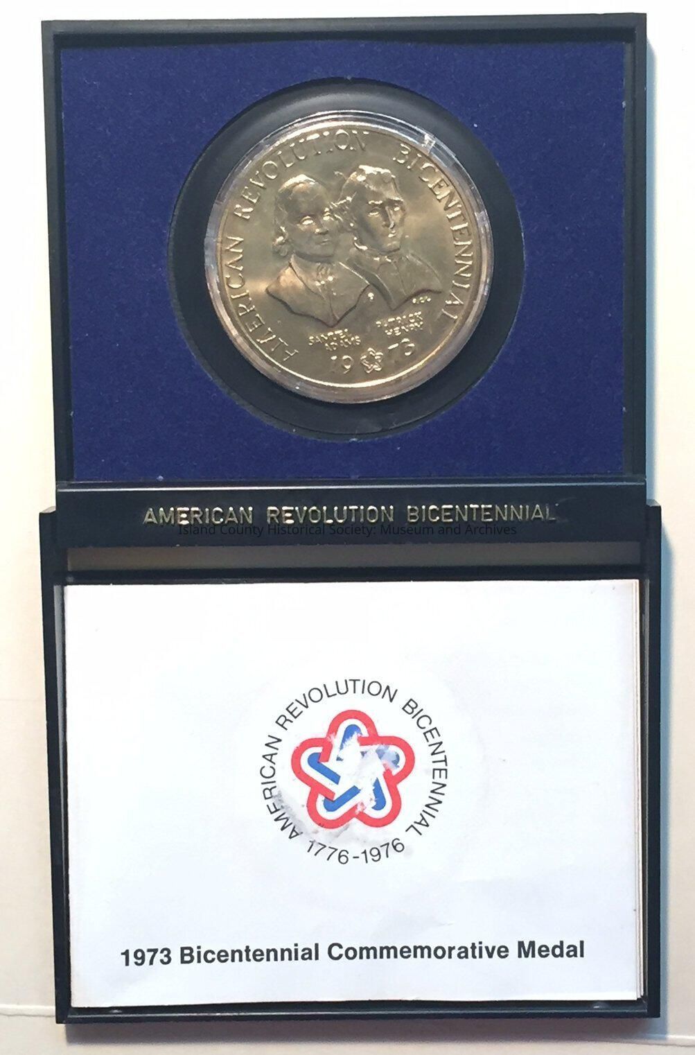 Commemerative coin. Given by Dr. Heap. Coin in plastic case which sits inside a commemorative black case. Black case contains documentation of historical signifance of coin images. Black case has raised gold letters: "American Revolution Bicentennial 1776-1976".