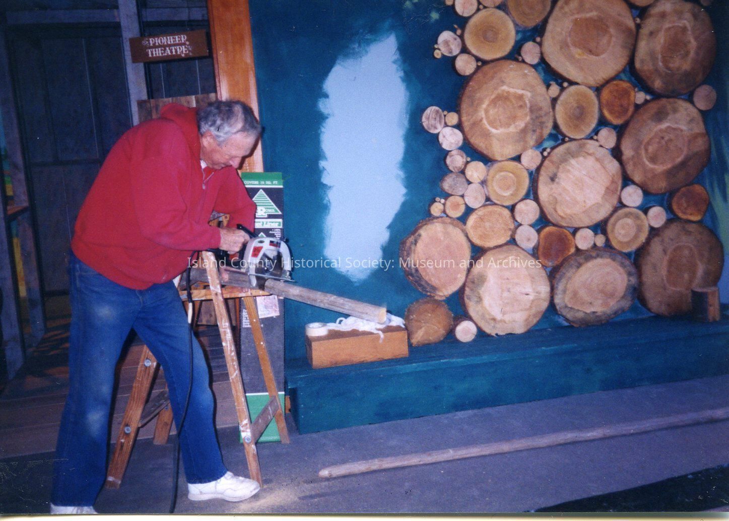 A color photo of a Museum exhibt, with a man in a red jacket working, near a wall of tree trunks. Handwritten on the back is "Ray Davis - Forest. Mar 29, 1995."