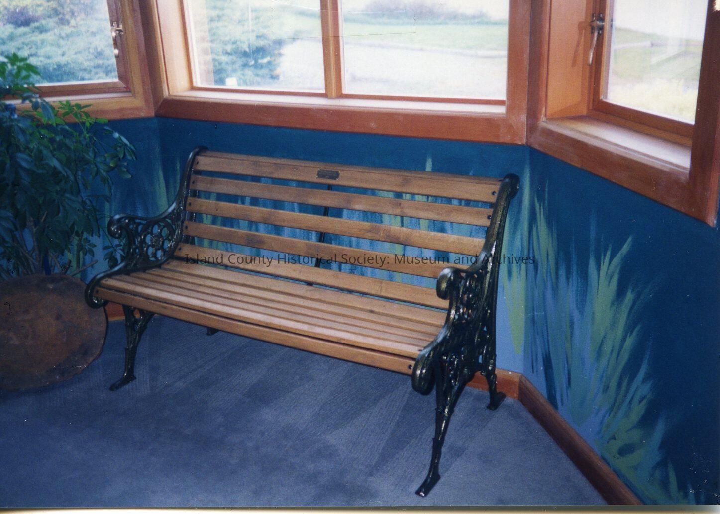 A color photo of a wooden bench under windows inside the Museum. Handwritten on the back is "Bench in Forest. Donated by Whidbey Isl. Bank. Apr 20, 1995."
