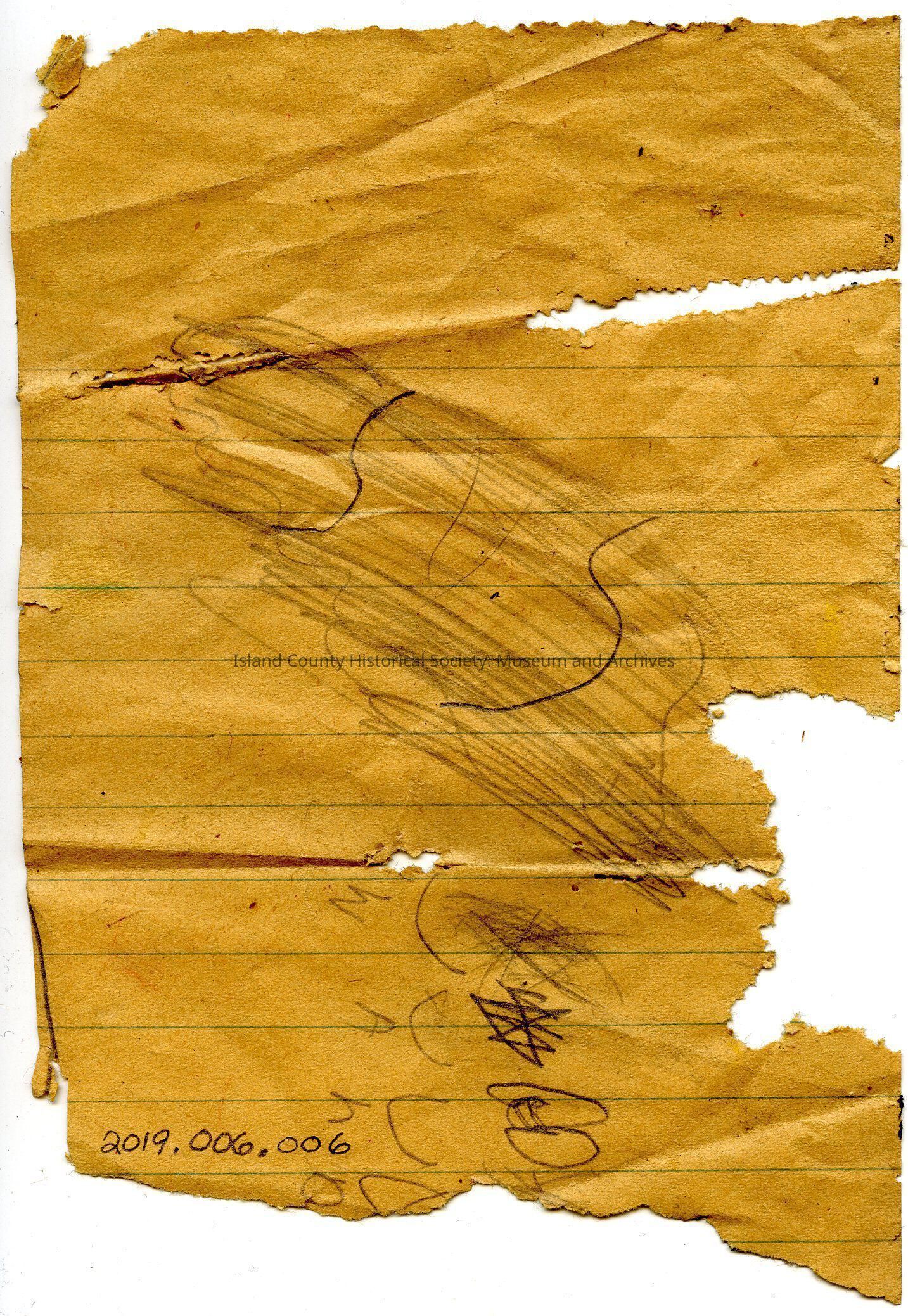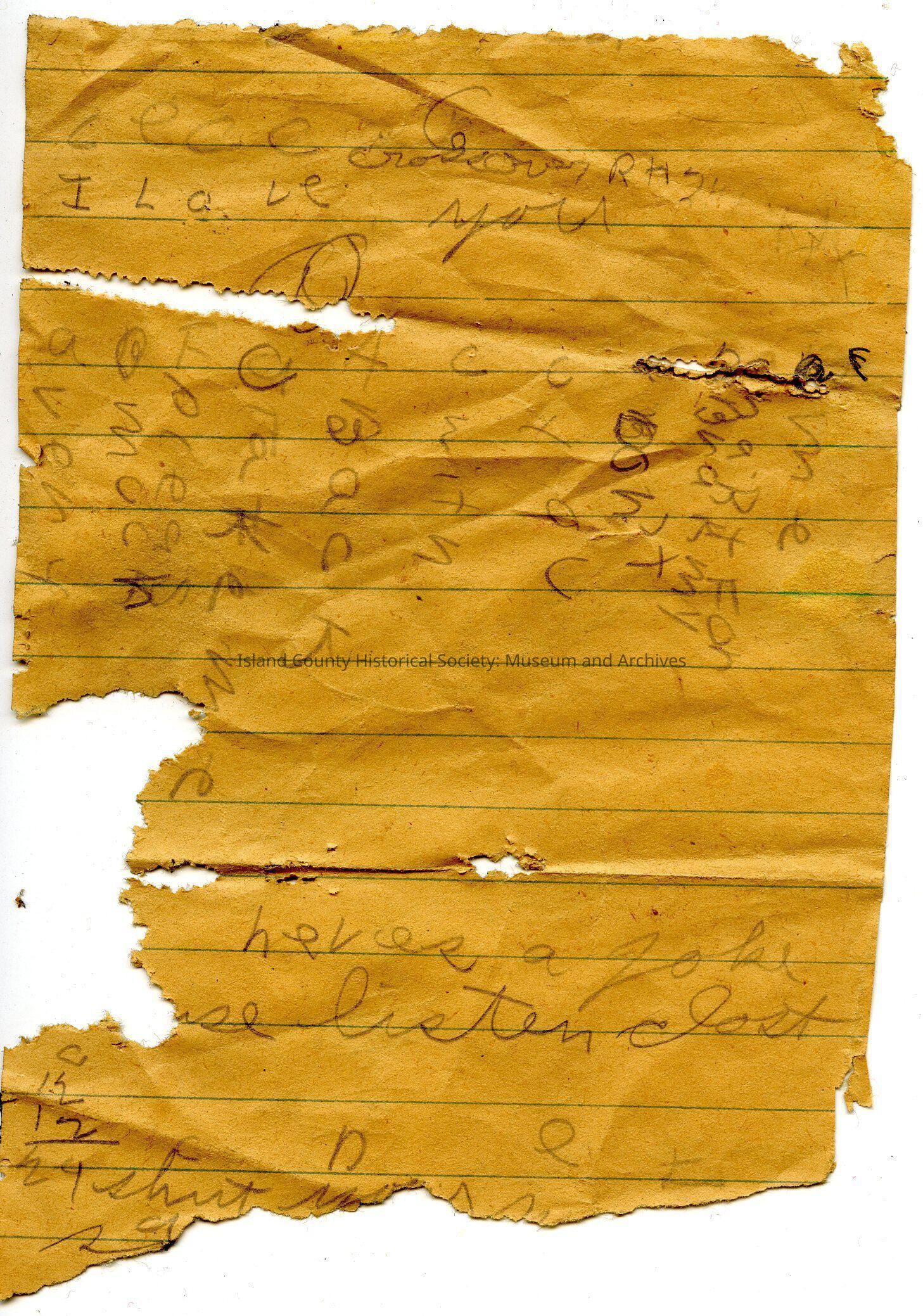 Hand-written note on lined paper with several different scribbled words. One sentence says, "I love you". 2019.006.006 Front & Back