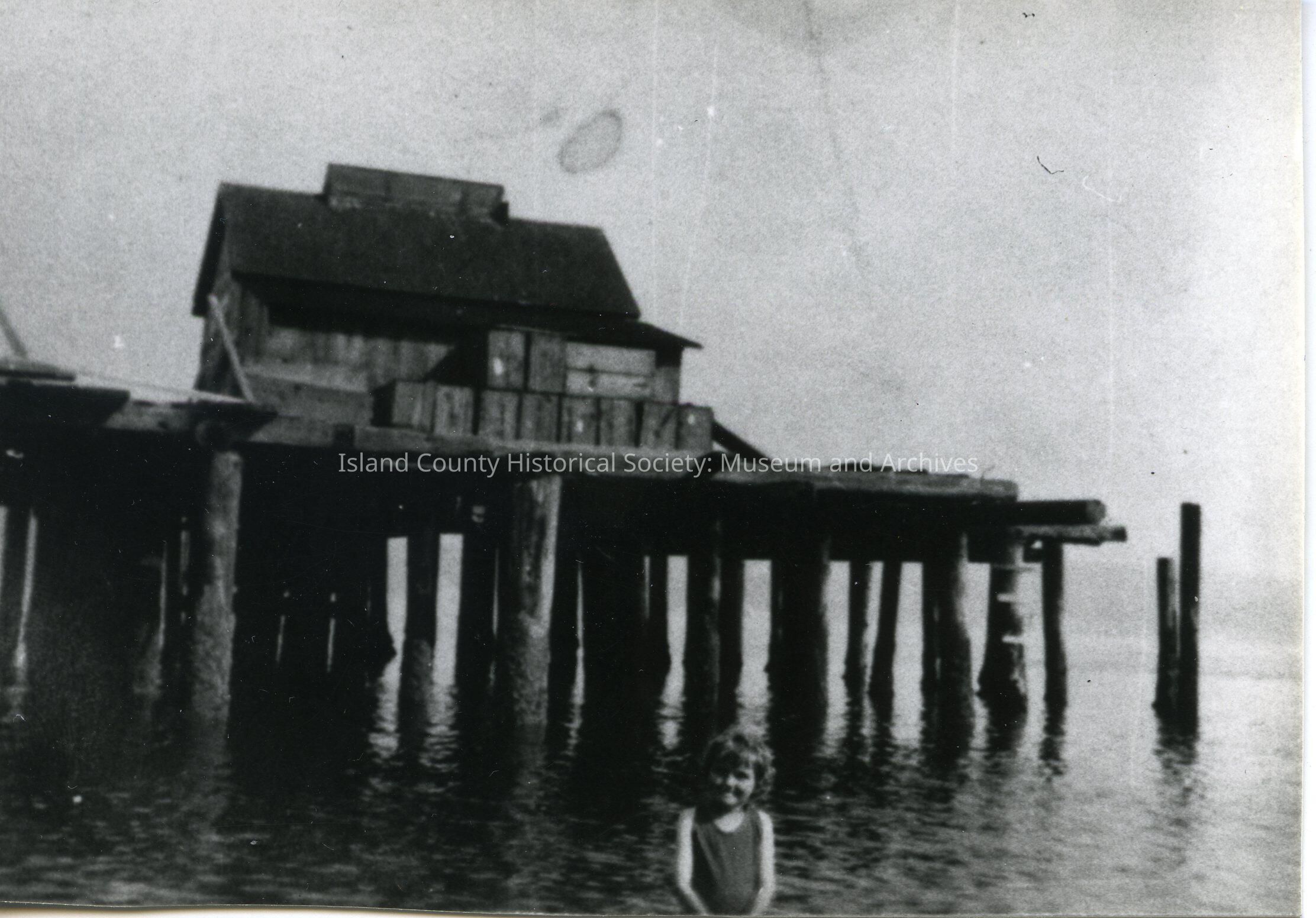 A black and white photo of a building on a dock over the water. A young girl is standing in the foreground. On the back is a typed message saying "The warehouse on the Glendale dock, used for storing freight."