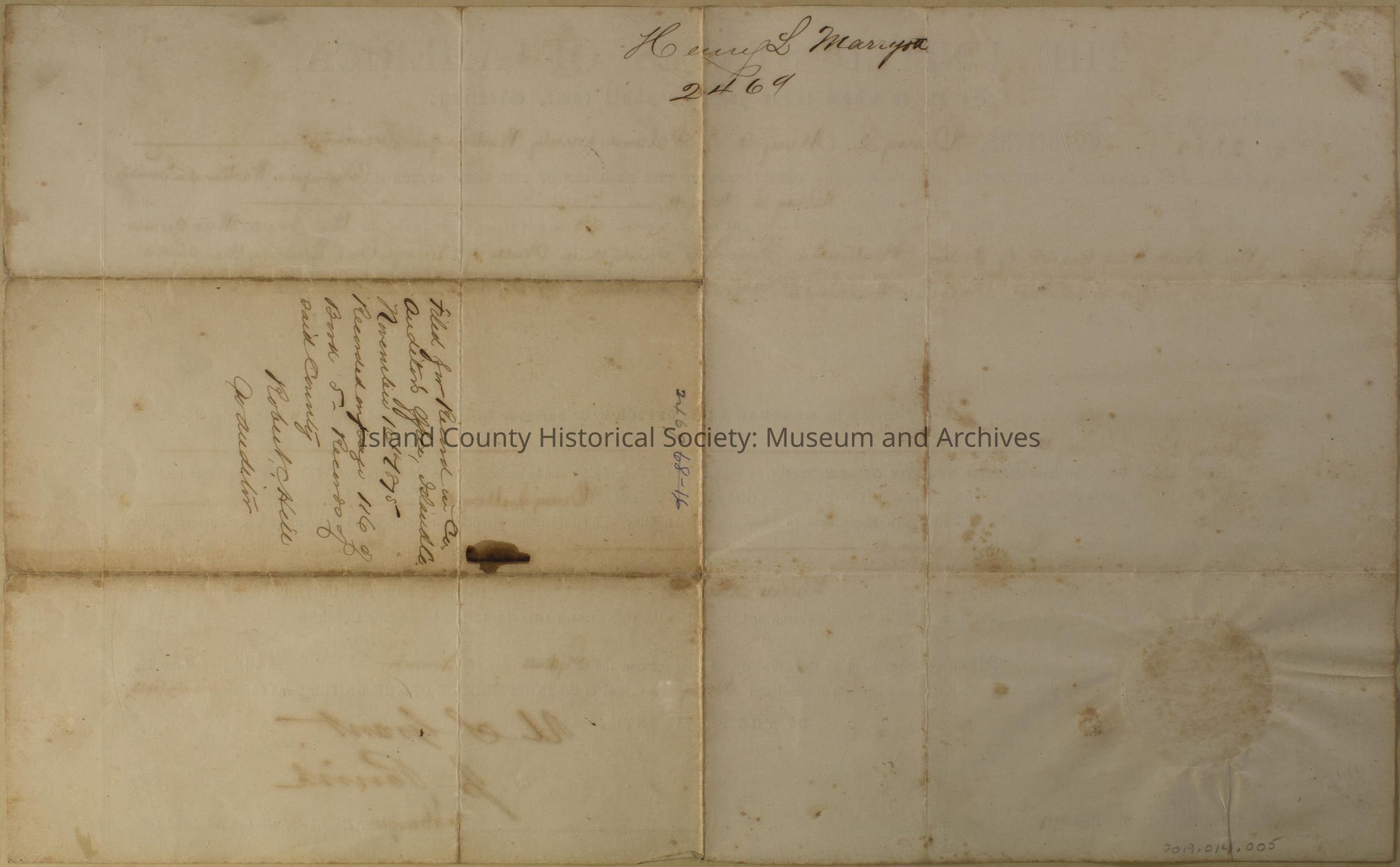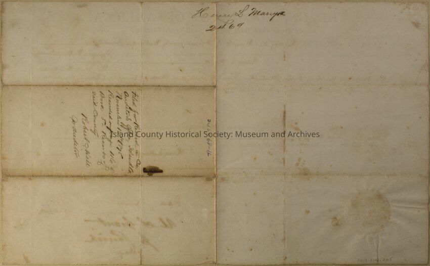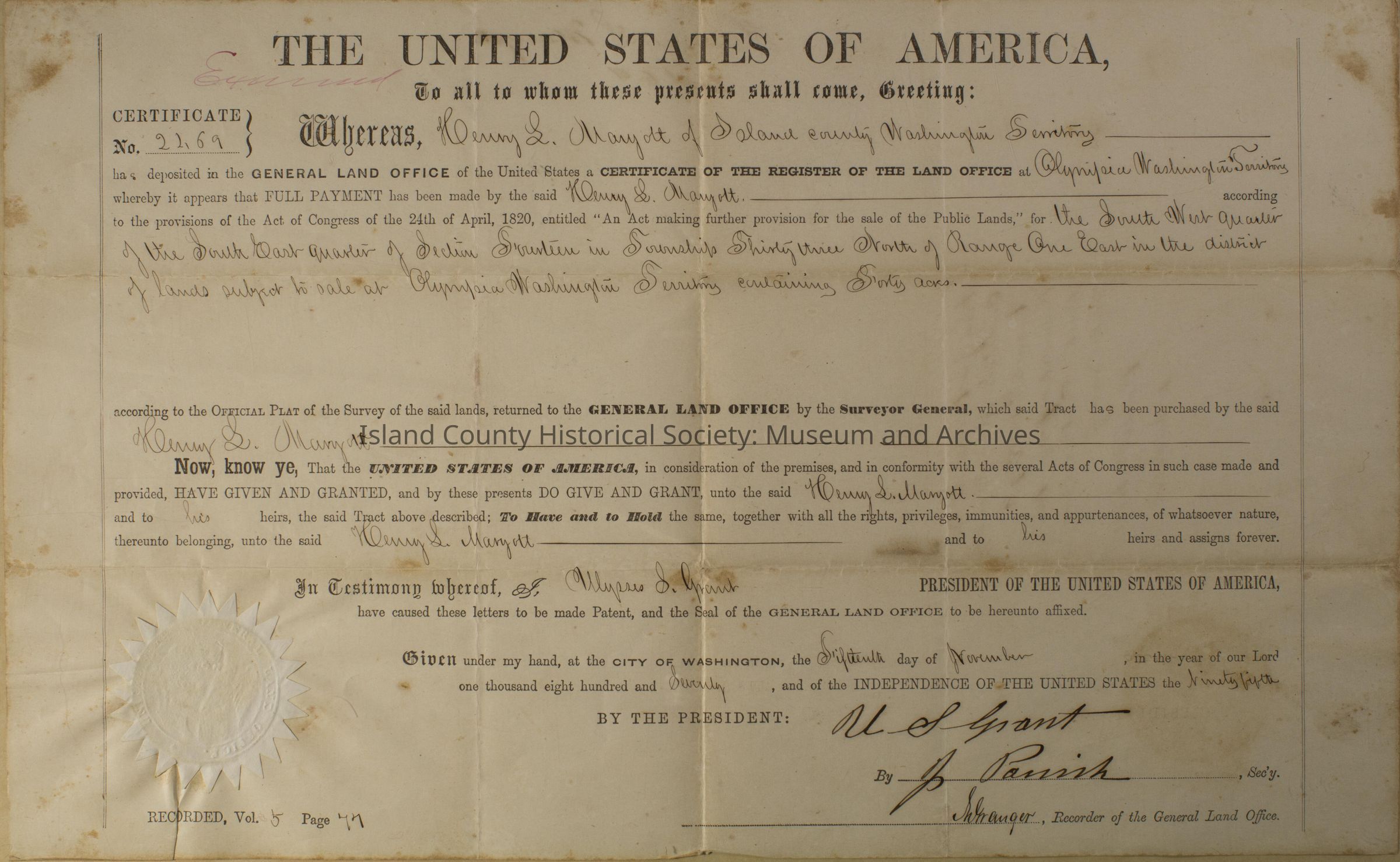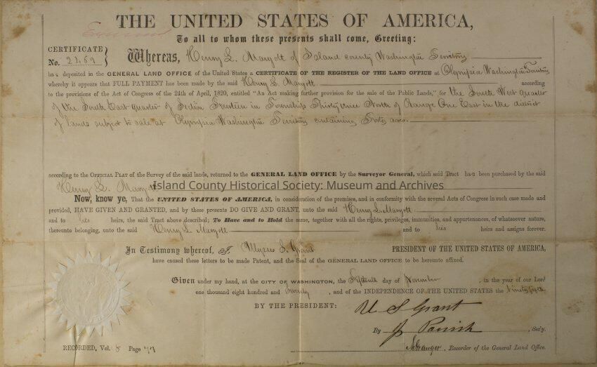 Land grant for Henry L. Maryott, signed by U. S. Grant on November 15, 1870. Certificate number 2298. For: the southwest quarter of the South East quarter of Section seventeen in Township Thirty-Three, north of Range One East in the District of lands subject to sale at Olympia, Washington Territory containing forty acres.