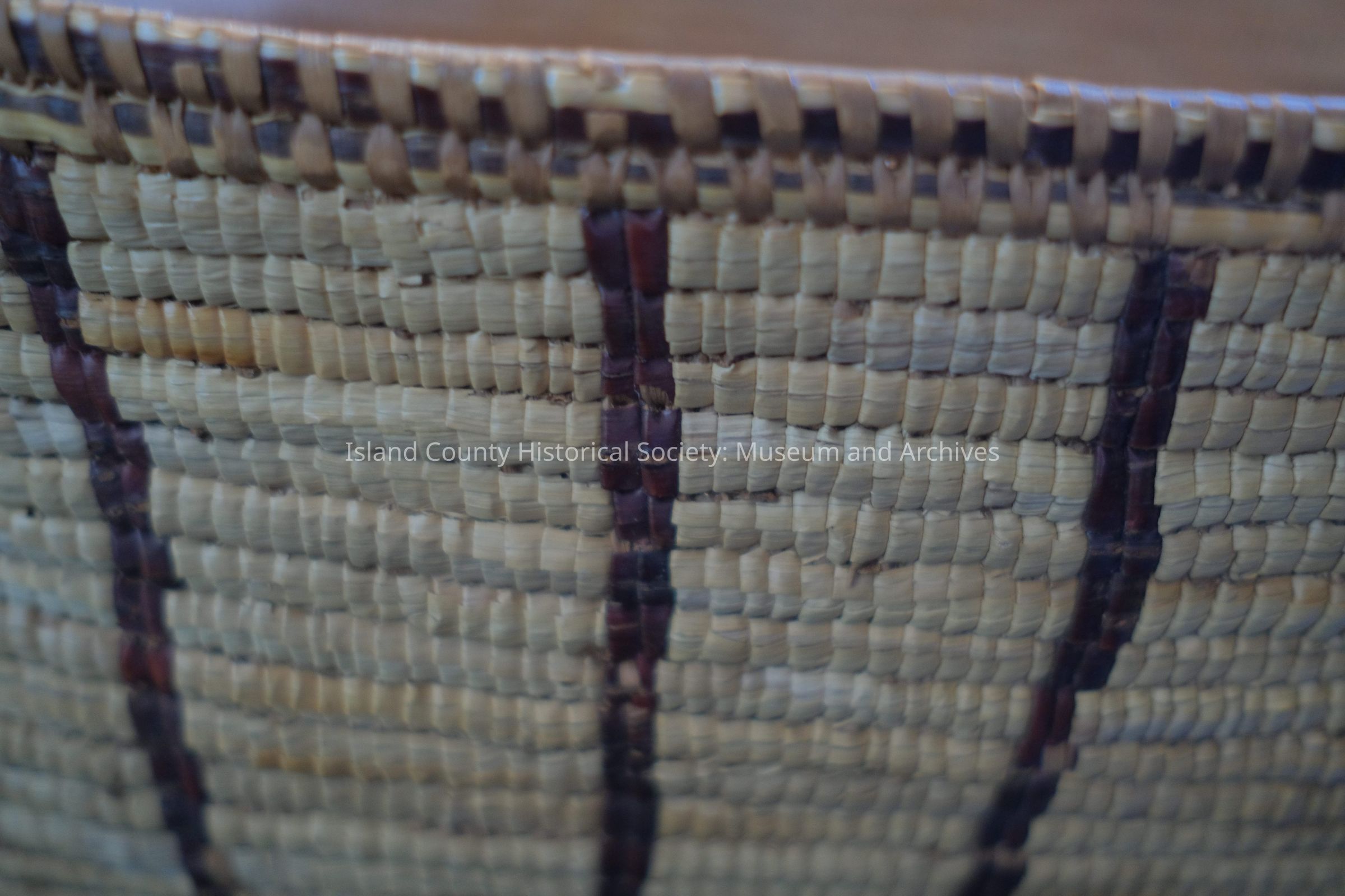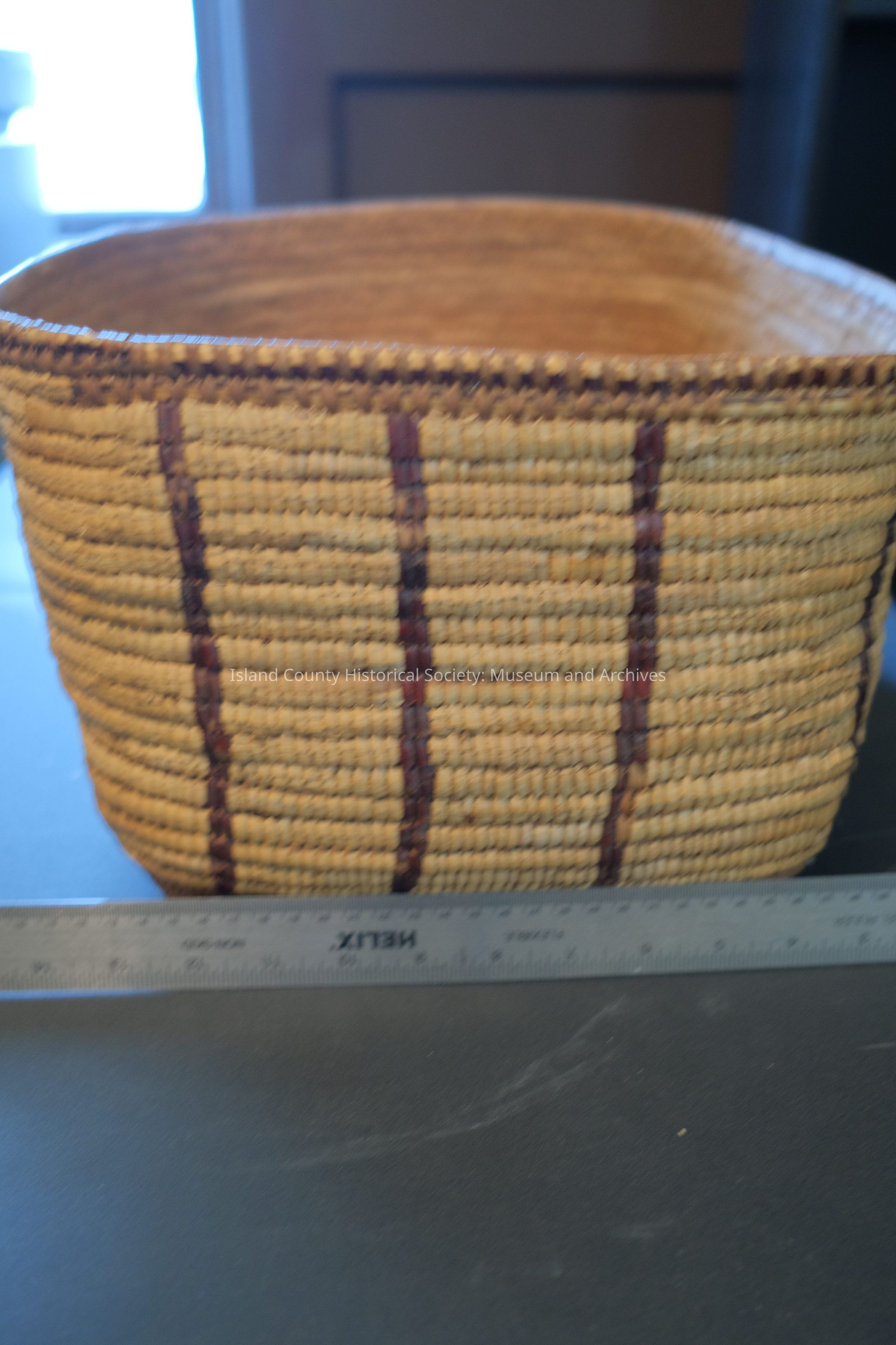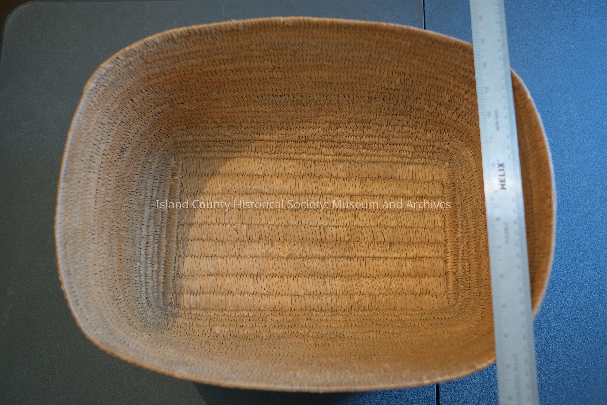 woven Indigenous basket, "Burden basket", deep, coil, oblong, bear grass