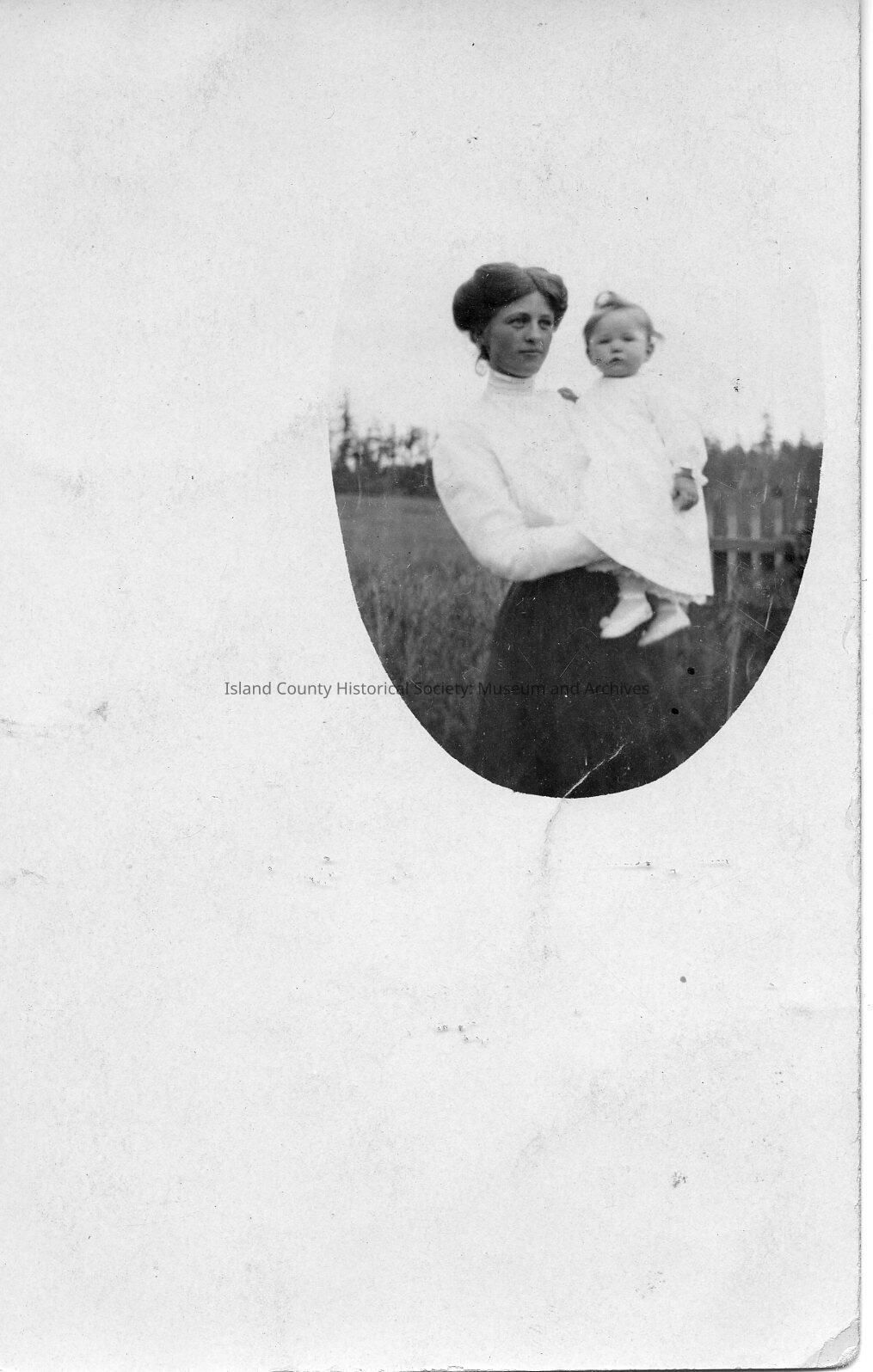 Woman in white blouse and dark skirt holds toddler dressed in white. Outdoors. Augusta Eerkes, wife of Ernest, 1864-1921. On back: Gertie Erkes H- Strating. Anna.