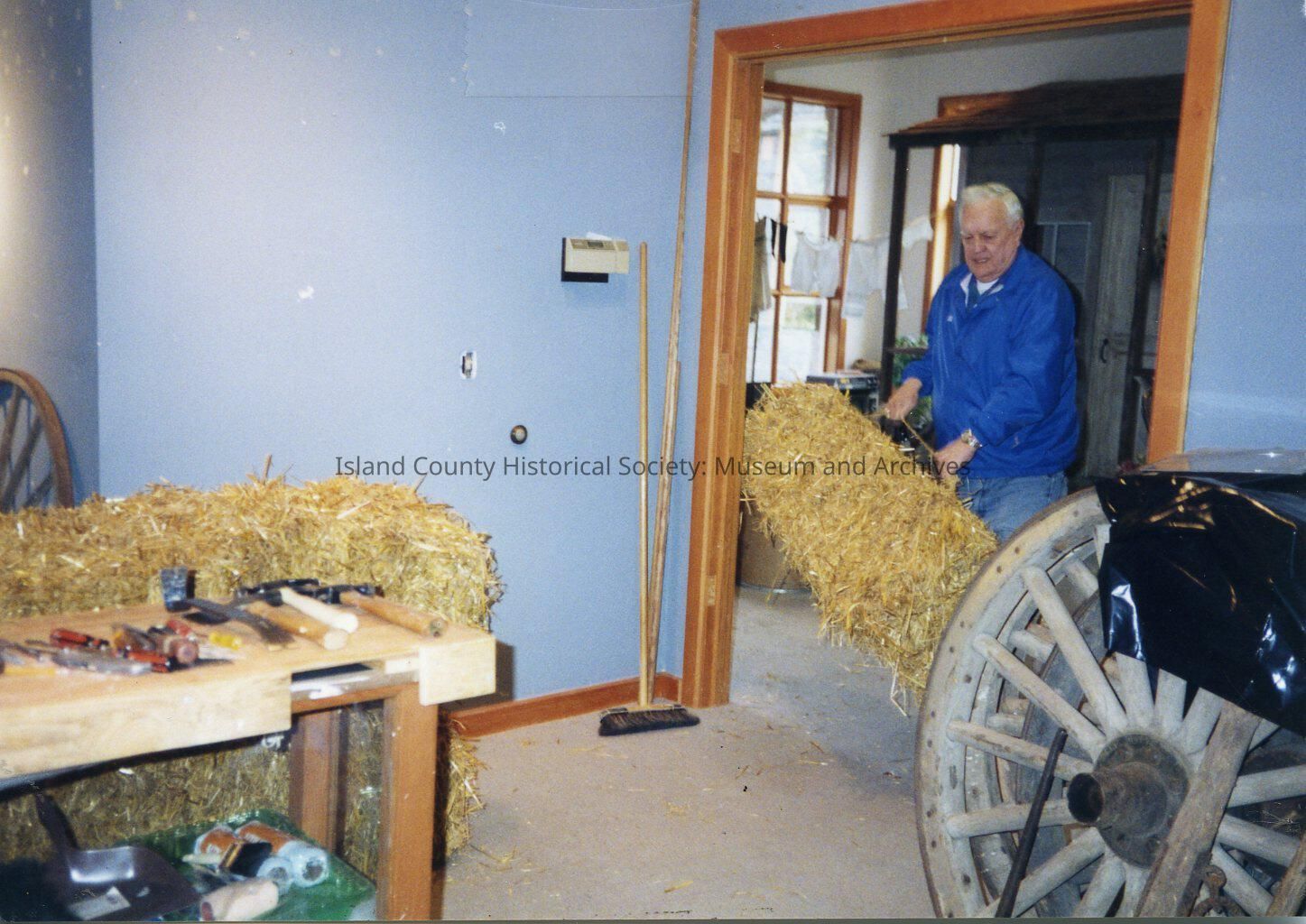 A color photo of a man inside the Museum moving hay from one room to another room where it is stacked. There is a wagon wheel on the right. Handritten on the back is "Bill Huffsteller. Mar. 17, 1995."