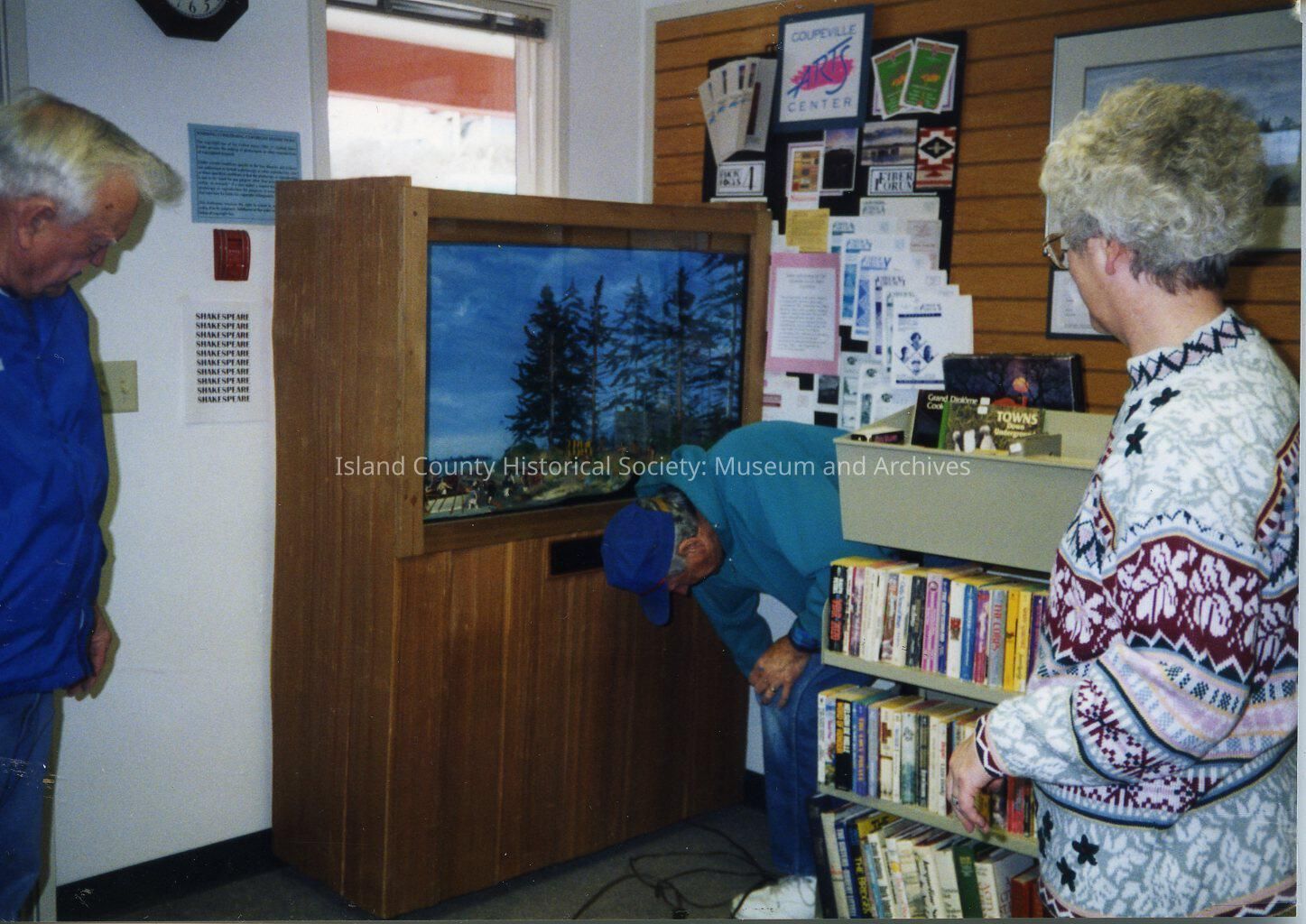 A color photo of an exibit. Showing books on shelfs and a diarama. There is a man on the left and a man bending down in the middle and a woman on the right. Handwritten on the back is "Delivering diarama to Coupeville Library, Mar 11, 1995."