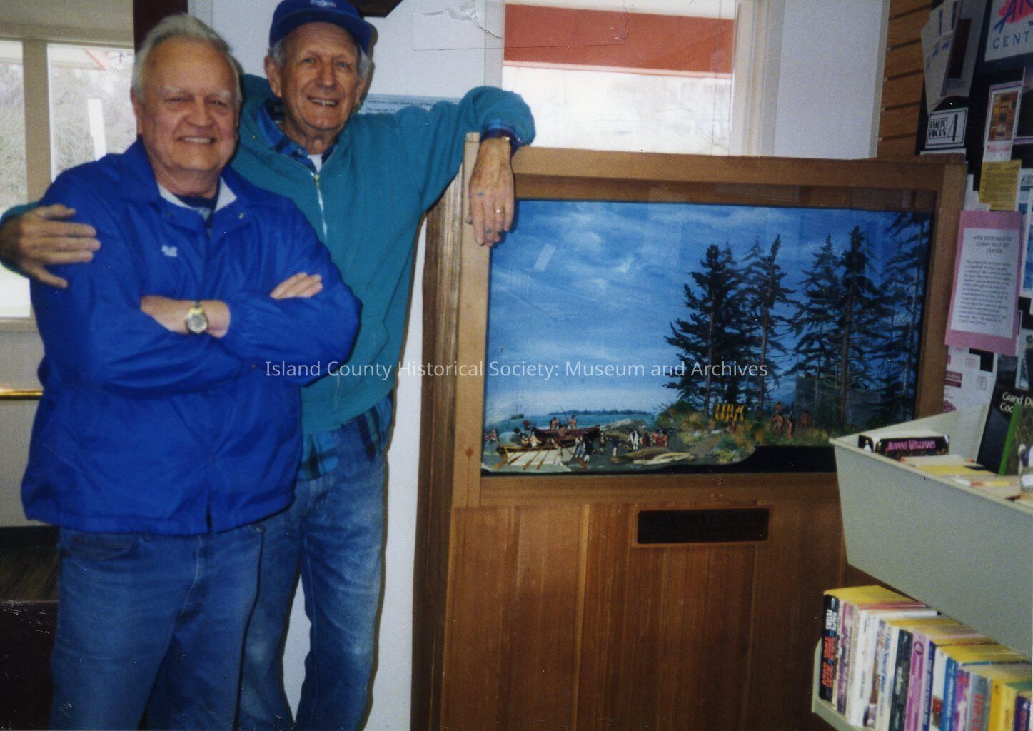 A color photo of an exibit. Showing books on shelfs and a Diarama. There are two men standing together, smiling, on the left by the diarama. Handwritten on the back is "Bill Huffstetler/ Ray Davis, Mar 11, 1995."Made/Created