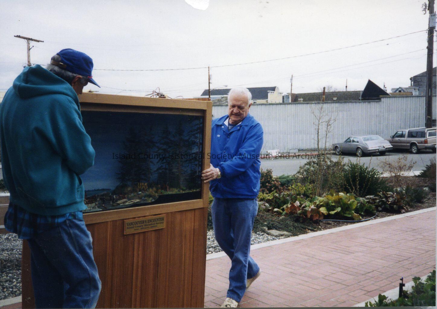 A color photo of two men moving a diarama outside. Handwritten on the back is "Diarama, Mar 11, 1995."