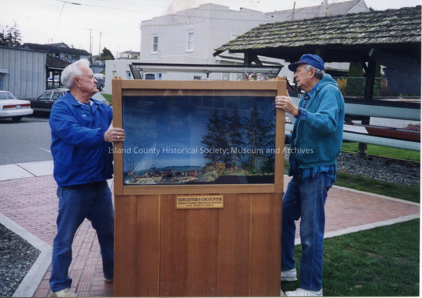 A color photo of two men moving a Diarama outside the Museum. Handwritten on the back is "Diarama, Mar 11, 1995."