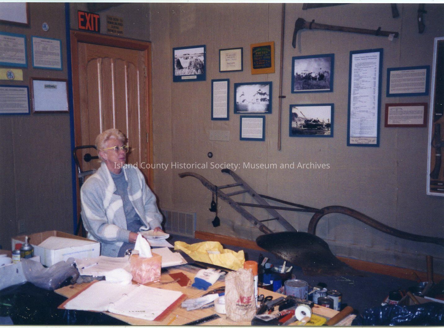 A color photo of woman sitting down in the Museum. There is a desk in front of her and a wall beyond with pictures and lists. There is a tool in front of her. Handwritten on the back is "Joan Houchen, Apr. 1995." Another note "Yes Joan, it will really get finished!" "Dedicated to our long suffering President of the Board - Joan Houchen!"