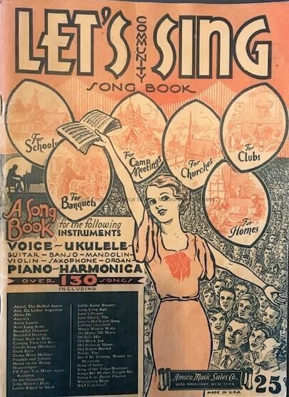 1933 Let's Sing Community Songbook. The book was donated by Liz Sherman from the estate of Herbert Gildow. The book is orange and blue in colors with the words Let's Sing across the top and a female holding open a songbook in front of a crowd of people. The book contains over 130 songs and is for the following instruments voice-ukulele, guitar, banjo, mandolin, violin, saxophone, organ, piano, and harmonica.Lexicon