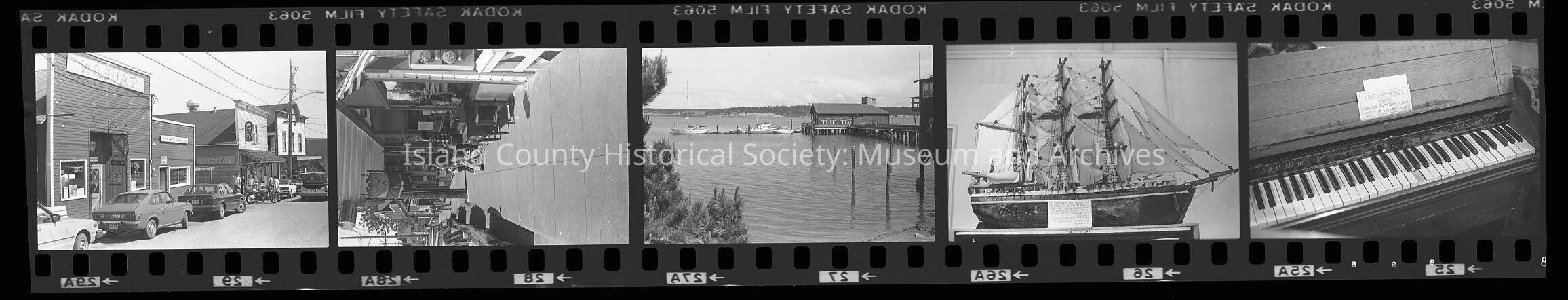 A negative of a photo. There are five pictures in the strip. 25 is piano keys. 26 is a ship. 27 is the dock and water. 28 is buildings. 29 is buidlings.