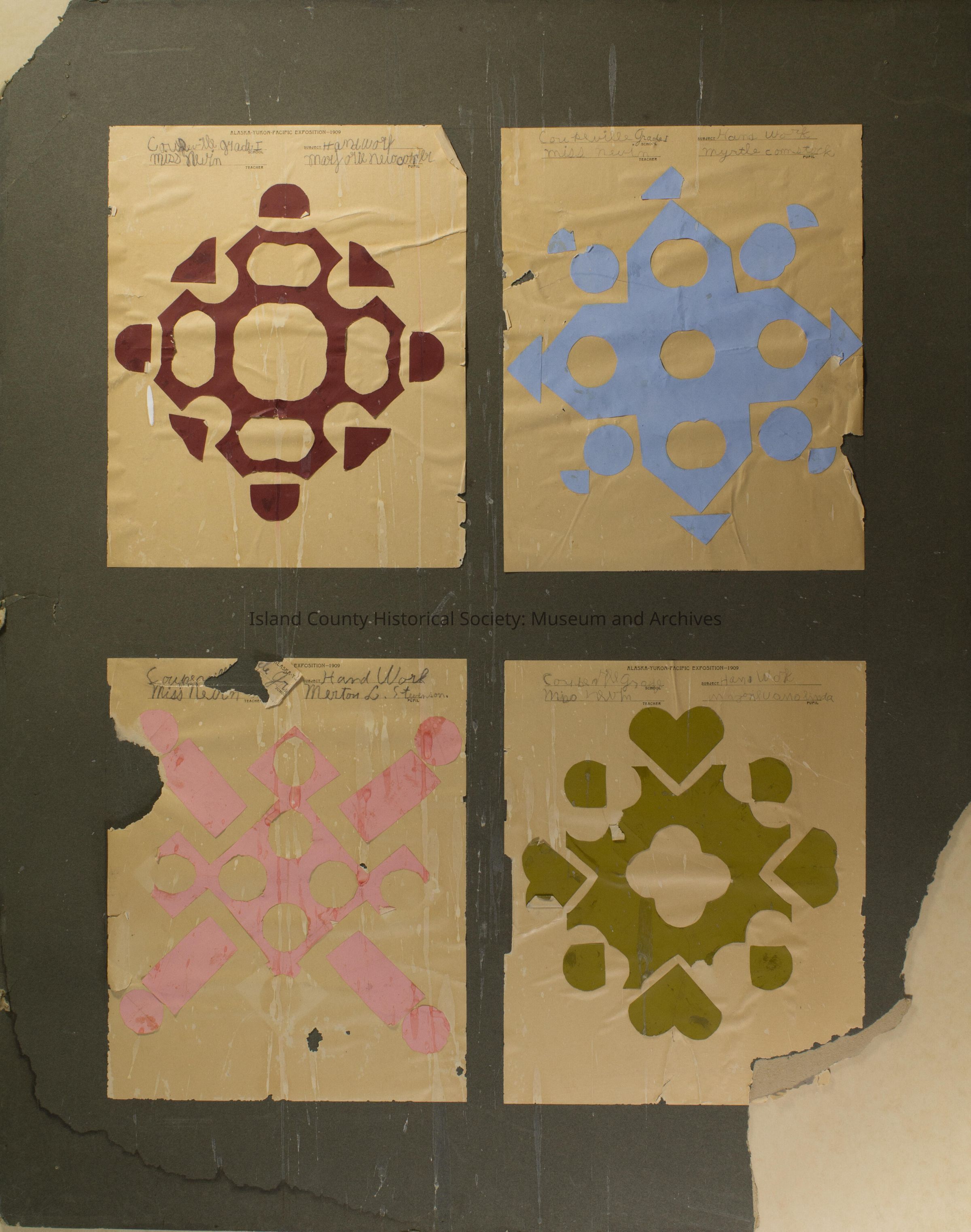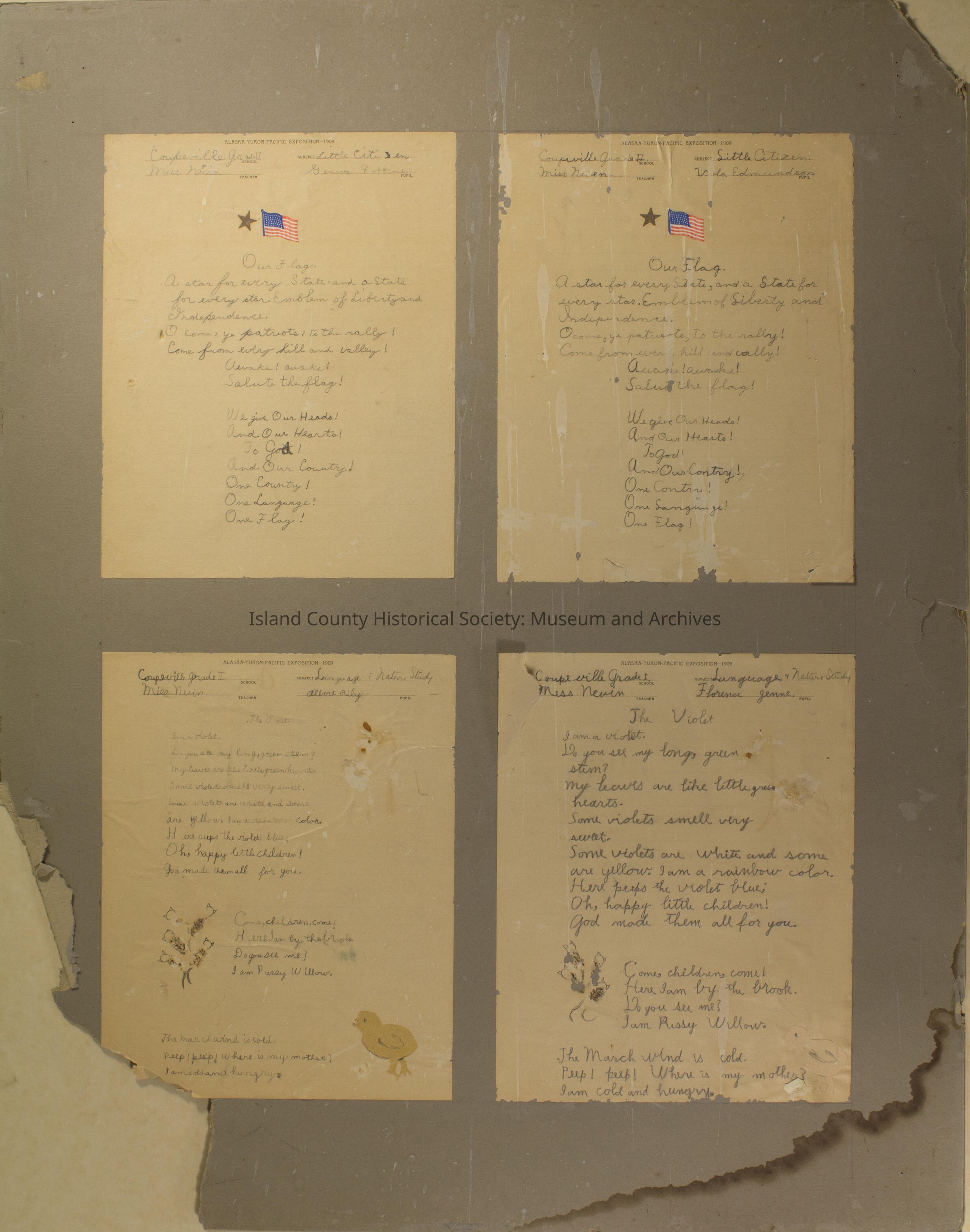 Poster, a large cardboard for presentation at the 1909 Alsaka-Yukon-Pacific Exposition. There are four school work lined papers pasted on both sides. On one side are two pages at the top from Grade II, poem "Our Flag" and on the bottom, two pages from Grade I, poem "The Violet". On the other side are four pages from Grade I, cutout geometric designs in four color.
