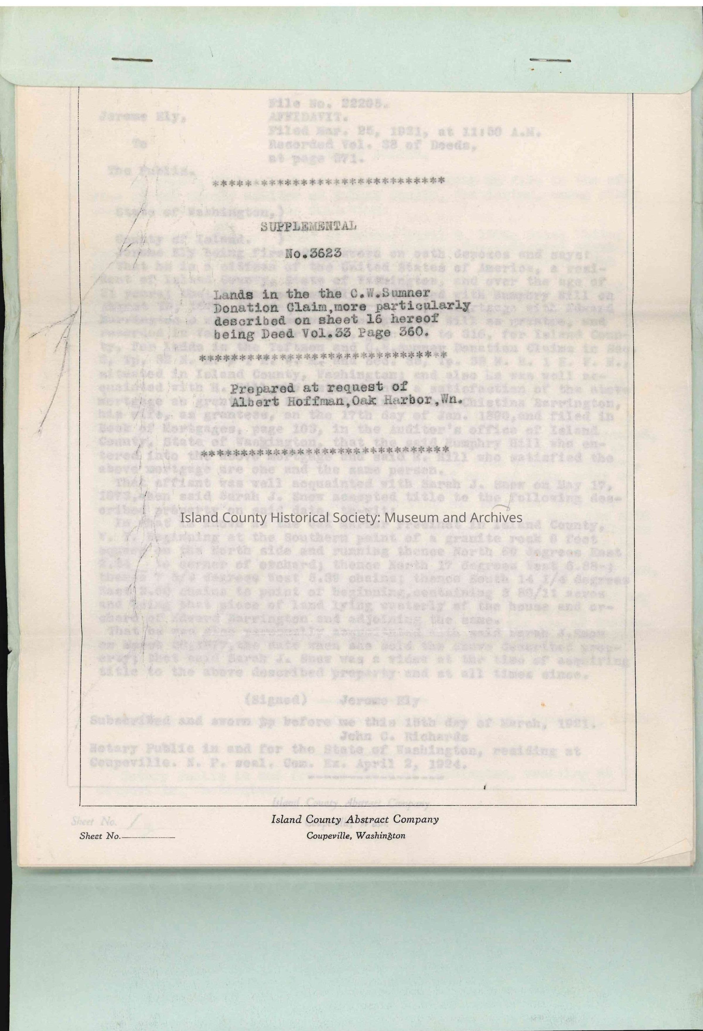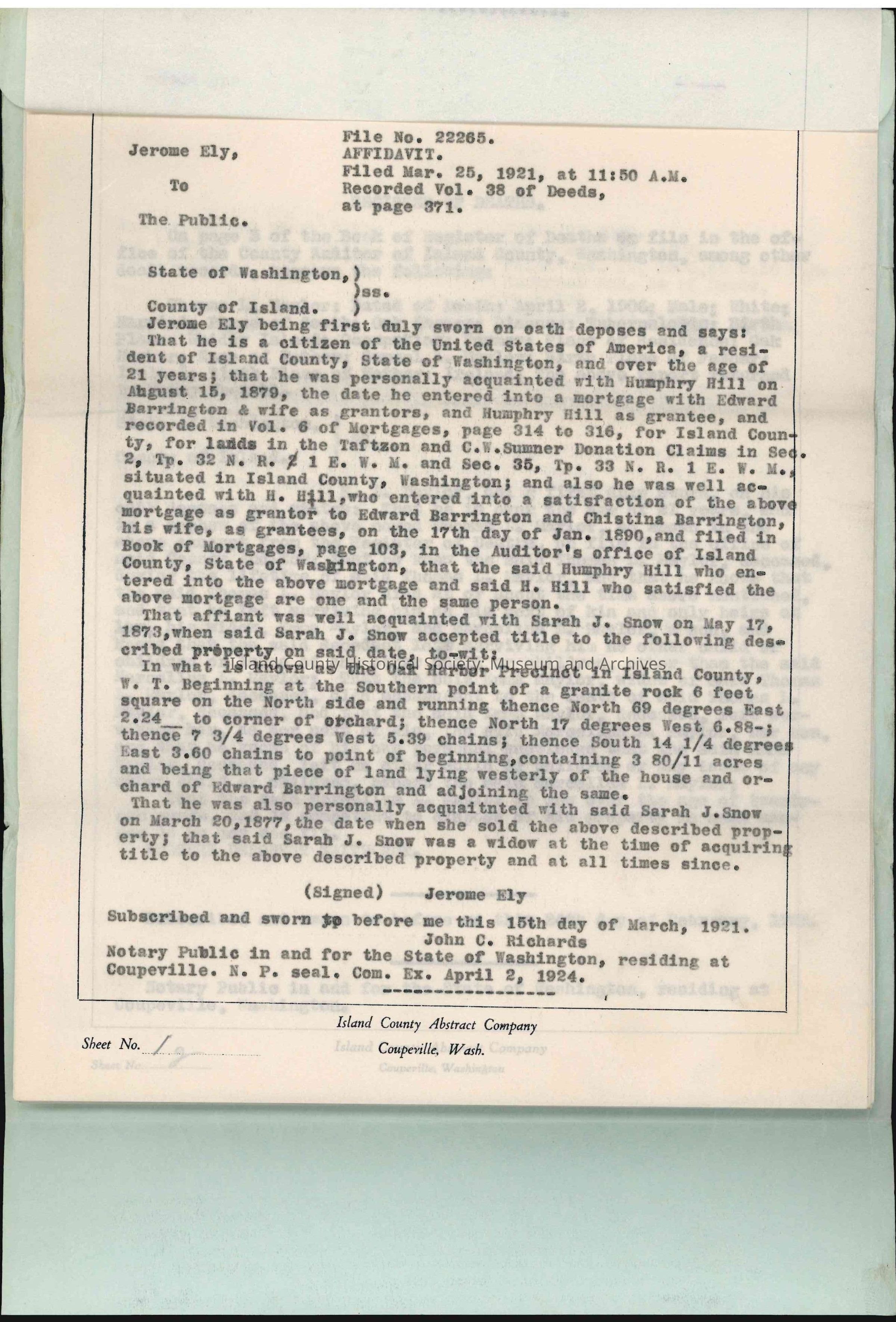 The first record filed in this Abstract is an affidavit sworn by Jerome Ely, c. 1921.