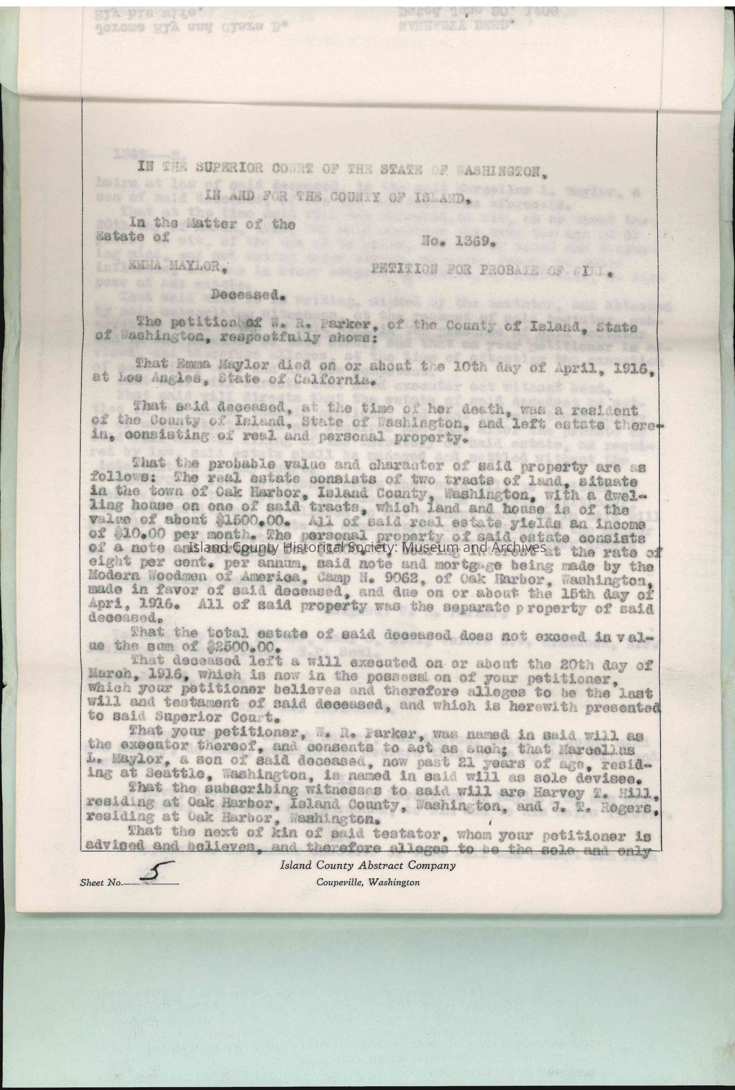 This Abstract of Title contains affidavits, register of deaths (Thomas L. Maylor), warranty deeds, petition for probate of will (estate of Emma Maylor), inventories and appraisements of the estate of Emma Maylor, and other legal filings relating to the estate of Emma Maylor.
